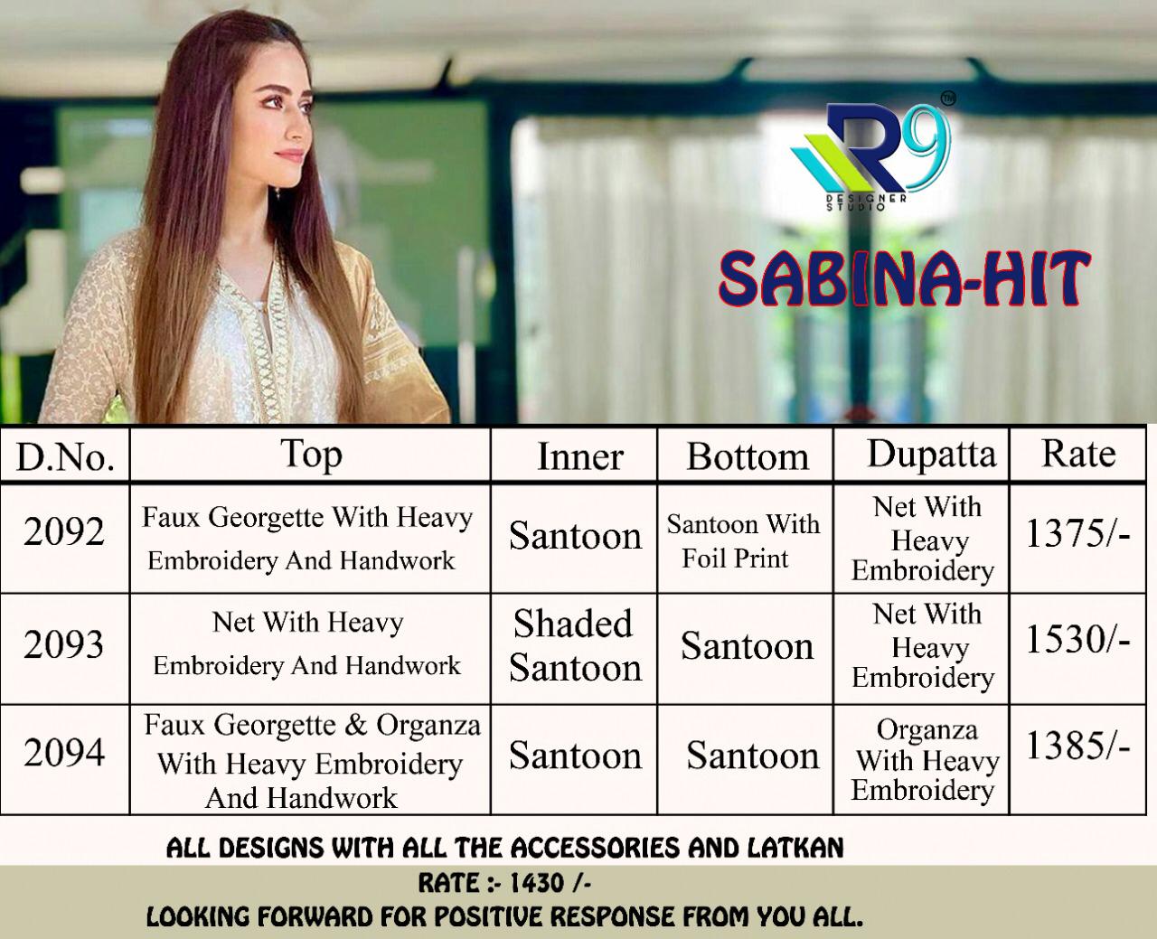 Buy Online Sabina Hit By R9 Pakistani Suits Wholesale Supplier Gujarat 3 Pcs of Full Catalogue at Wholesale Price. Looking for Sabina Hit By R9 Pakistani Suits Wholesale Supplier Gujarat Full Catalouge at Best Price? Buy Now Sabina Hit By R9 Pakistani Suits Wholesale Supplier Gujarat at Wholesale Rate of Rs 4290 with Total 3 Pcs from authroized dealer and supplier of Brand. Cost of Each piece is just only Rs 1430 which is very low and affordable price to resale the product in your retail store ,This is Surat based Wholesale Supplier & Dealer of Brand. Click on Brand name to Know more about Brand's products.Call or Whatsapp on 9898838984 for booking or enquiry