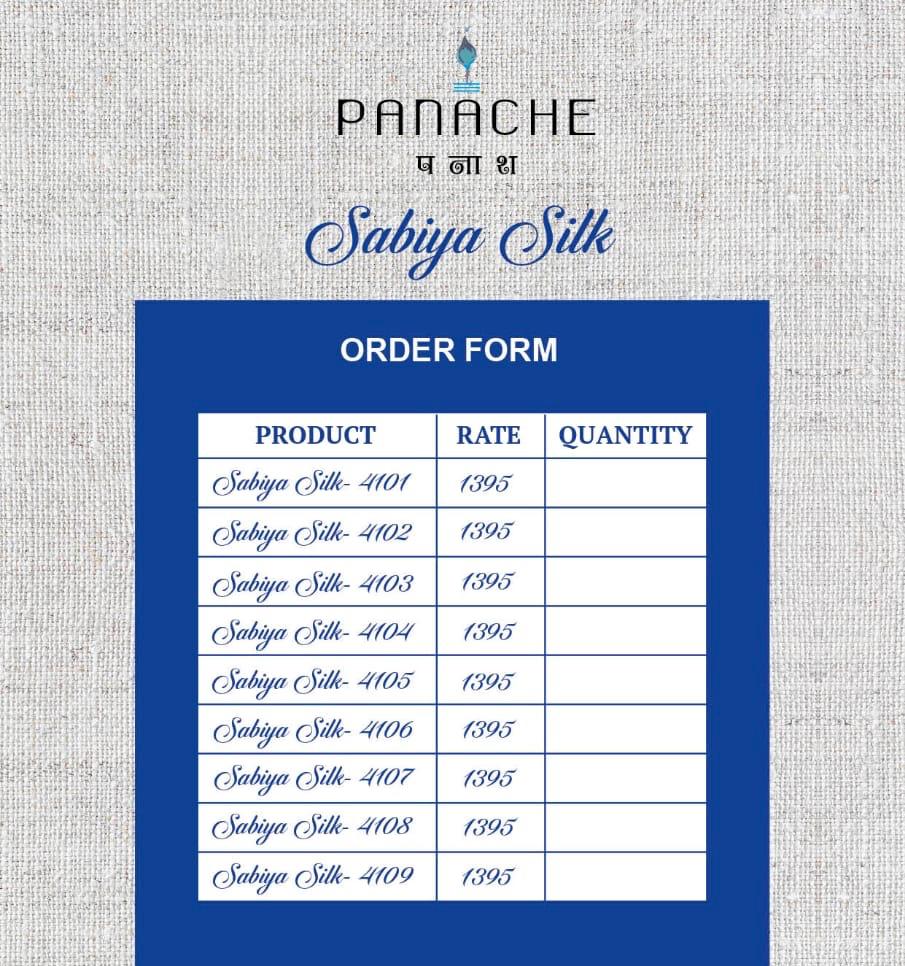 Buy Online Sabiya Silk By Panache Series 4101 Occasion Wear Sarees Wholesale Supplier Surat 9 Pcs of Full Catalogue at Wholesale Price. Looking for Sabiya Silk By Panache Series 4101 Occasion Wear Sarees Wholesale Supplier Surat Full Catalouge at Best Price? Buy Now Sabiya Silk By Panache Series 4101 Occasion Wear Sarees Wholesale Supplier Surat at Wholesale Rate of Rs 12555 with Total 9 Pcs from authroized dealer and supplier of BRAND'S Brand. Cost of Each piece is just only Rs 1395 which is very low and affordable price to resale the product in your retail store ,This is Surat based Wholesale Supplier & Dealer of BRAND'S Brand. Click on Brand name to Know more about BRAND'S Brand's products.Call or Whatsapp on 9898838984 for booking or enquiry
