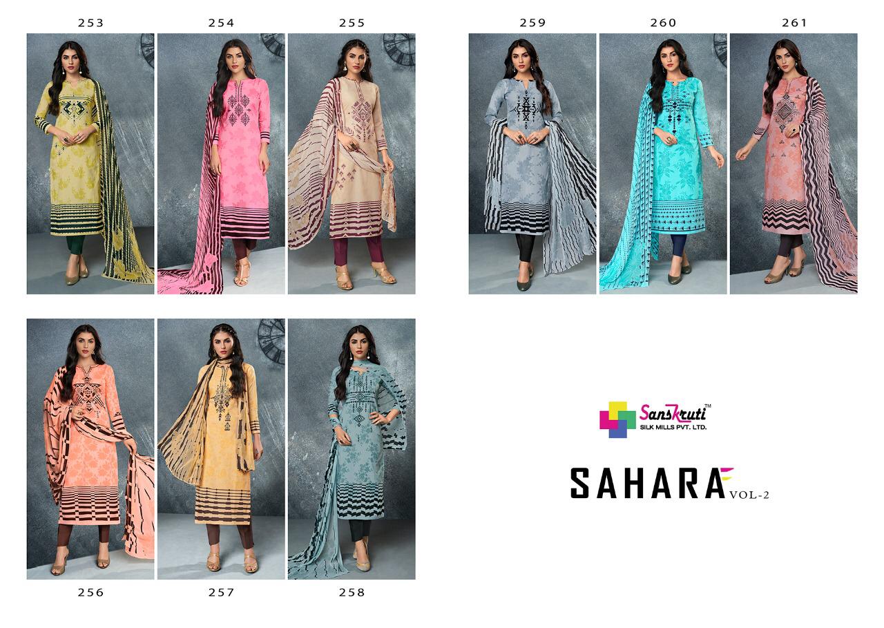 Buy Online Sahara Vol 2 By Sanskruti Silk Mills 253 Series Fancy Lawn Cotton Salwar Kameez Catlog Wholesaler Surat 9 Pcs of Full Catalogue at Wholesale Price. Looking for Sahara Vol 2 By Sanskruti Silk Mills 253 Series Fancy Lawn Cotton Salwar Kameez Catlog Wholesaler Surat Full Catalouge at Best Price? Buy Now Sahara Vol 2 By Sanskruti Silk Mills 253 Series Fancy Lawn Cotton Salwar Kameez Catlog Wholesaler Surat at Wholesale Rate of Rs 5355 with Total 9 Pcs from authroized dealer and supplier of Sanskruti Brand. Cost of Each piece is just only Rs 595 which is very low and affordable price to resale the product in your retail store ,This is Surat based Wholesale Supplier & Dealer of Sanskruti Brand. Click on Brand name to Know more about Sanskruti Brand's products.Call or Whatsapp on 9898838984 for booking or enquiry