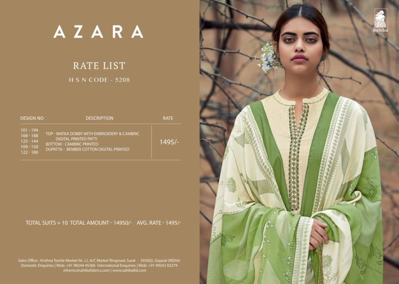 Buy Online Sahiba Azara Matka Dobby Embroidered Designer Suits Wholesale Supplier India 10 Pcs of Full Catalogue at Wholesale Price. Looking for Sahiba Azara Matka Dobby Embroidered Designer Suits Wholesale Supplier India Full Catalouge at Best Price? Buy Now Sahiba Azara Matka Dobby Embroidered Designer Suits Wholesale Supplier India at Wholesale Rate of Rs 14950 with Total 10 Pcs from authroized dealer and supplier of SAHIBA Brand. Cost of Each piece is just only Rs 1495 which is very low and affordable price to resale the product in your retail store ,This is Surat based Wholesale Supplier & Dealer of SAHIBA Brand. Click on Brand name to Know more about SAHIBA Brand's products.Call or Whatsapp on 9898838984 for booking or enquiry