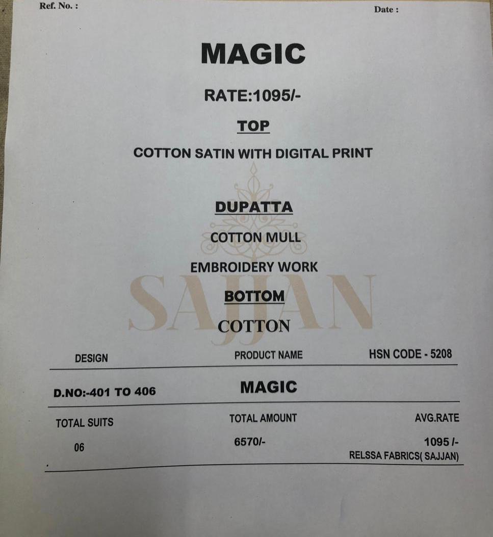 Buy Online Sajjan Magic Series 401 To 406 Designer Suits Wholesale Supplier Gujarat 6 Pcs of Full Catalogue at Wholesale Price. Looking for Sajjan Magic Series 401 To 406 Designer Suits Wholesale Supplier Gujarat Full Catalouge at Best Price? Buy Now Sajjan Magic Series 401 To 406 Designer Suits Wholesale Supplier Gujarat at Wholesale Rate of Rs 6570 with Total 6 Pcs from authroized dealer and supplier of Brand. Cost of Each piece is just only Rs 1095 which is very low and affordable price to resale the product in your retail store ,This is Surat based Wholesale Supplier & Dealer of Brand. Click on Brand name to Know more about Brand's products.Call or Whatsapp on 9898838984 for booking or enquiry