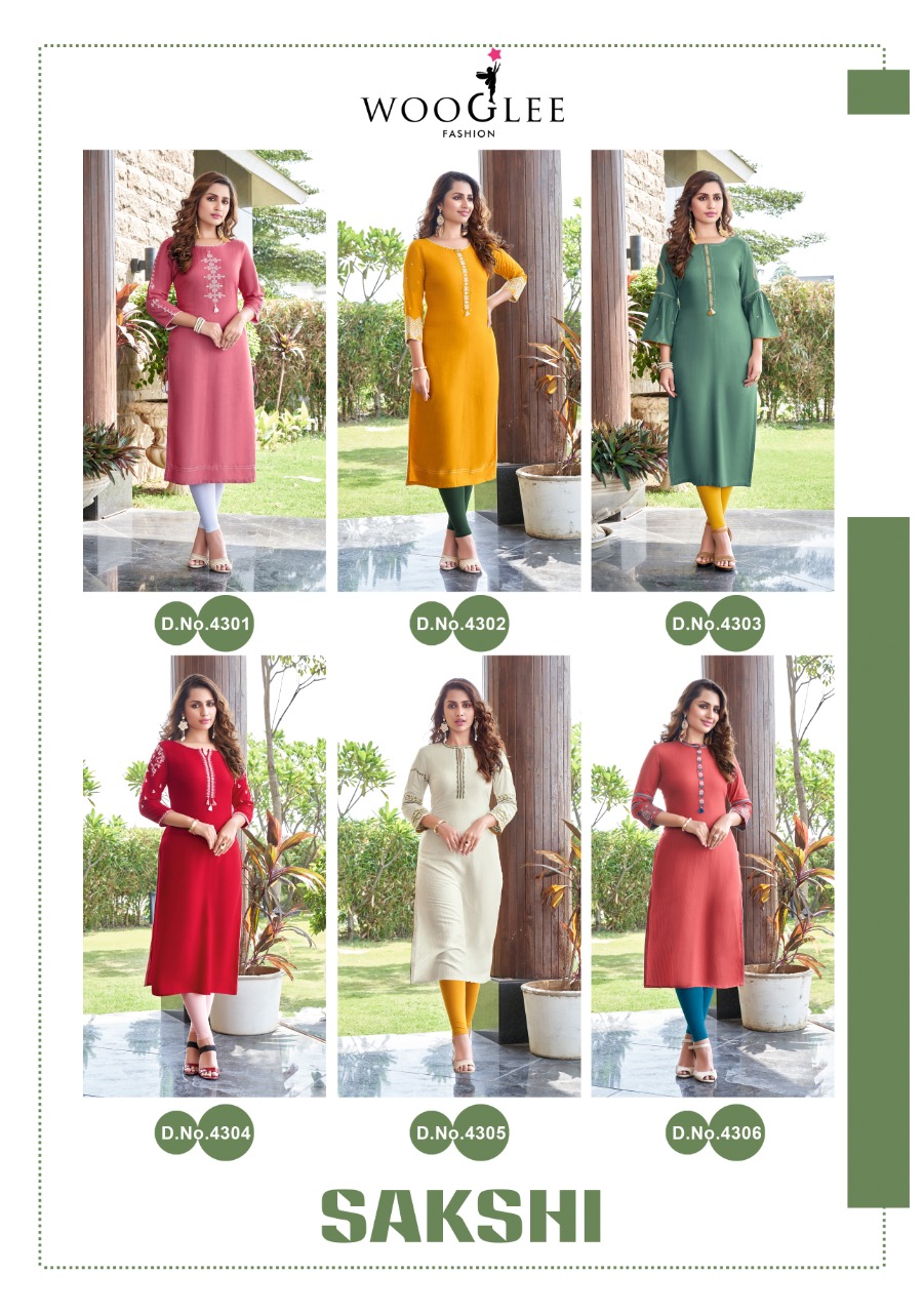 Brand : *WOOGLEE* Catalog Name : *Sakshi* Fabric : *Rayon Weaving Stripe* Work : *Embroidery* & *Handwork* Size : *M(38), L(40), XL(42), XXL(44), 3XL(46)* Designs : *6* Price : *490/-* Per Piece + GST |