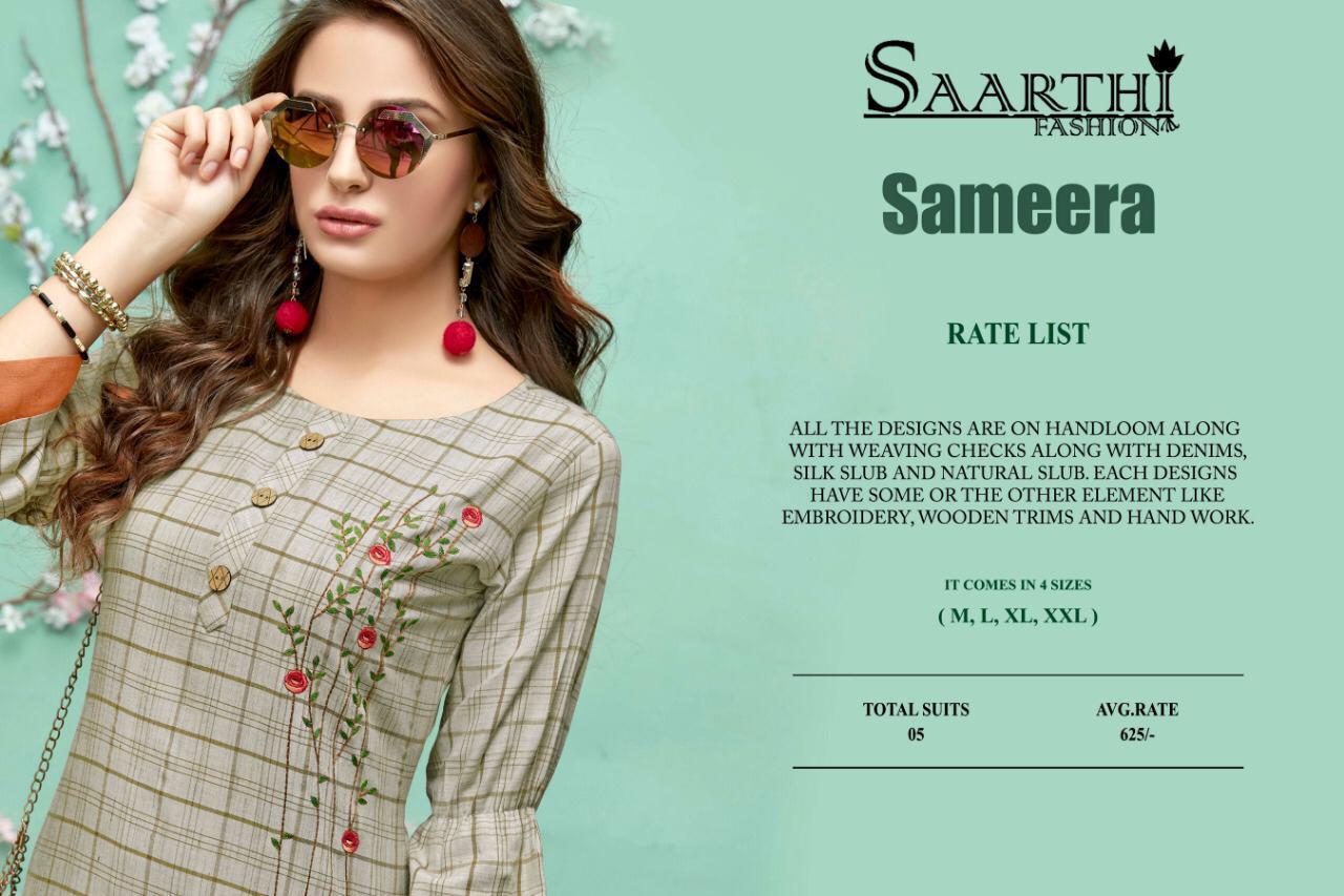 Buy Online Sameera By Sarthi Handloom Designer Kurtis Wholesale Supplier Nd Dealer Nitya Nx Surat 5 Pcs of Full Catalogue at Wholesale Price. Looking for Sameera By Sarthi Handloom Designer Kurtis Wholesale Supplier Nd Dealer Nitya Nx Surat Full Catalouge at Best Price? Buy Now Sameera By Sarthi Handloom Designer Kurtis Wholesale Supplier Nd Dealer Nitya Nx Surat at Wholesale Rate of Rs 3125 with Total 5 Pcs from authroized dealer and supplier of BRAND'S Brand. Cost of Each piece is just only Rs 625 which is very low and affordable price to resale the product in your retail store ,This is Surat based Wholesale Supplier & Dealer of BRAND'S Brand. Click on Brand name to Know more about BRAND'S Brand's products.Call or Whatsapp on 9898838984 for booking or enquiry