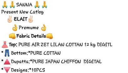 Brand - Sanna . Catlog name - Elita . Rate -895 per Pcs . Set to set . GST 5 Percent Extra. Delivery From tomorrow order and inquiry +919898838984 |