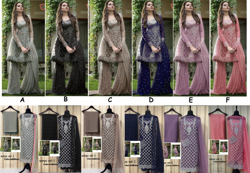 Buy Online Sanya Vol 1 By Hoor Tex 0054 Colours Fancy Party Wear Pakistani Style Salwar Kameez Catlog Wholesale Dealer Surat 6 Pcs of Full Catalogue at Wholesale Price. Looking for Sanya Vol 1 By Hoor Tex 0054 Colours Fancy Party Wear Pakistani Style Salwar Kameez Catlog Wholesale Dealer Surat Full Catalouge at Best Price? Buy Now Sanya Vol 1 By Hoor Tex 0054 Colours Fancy Party Wear Pakistani Style Salwar Kameez Catlog Wholesale Dealer Surat at Wholesale Rate of Rs 6900 with Total 6 Pcs from authroized dealer and supplier of Brand. Cost of Each piece is just only Rs 1150 which is very low and affordable price to resale the product in your retail store ,This is Surat based Wholesale Supplier & Dealer of Brand. Click on Brand name to Know more about Brand's products.Call or Whatsapp on 9898838984 for booking or enquiry
