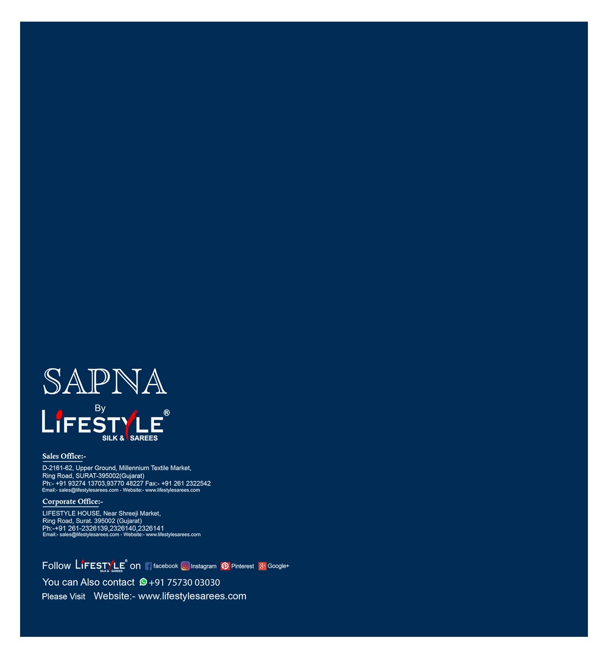 Buy Online Sapna By Lifestyle Manufacturer Traders Surat 6 Pcs of Full Catalogue at Wholesale Price. Looking for Sapna By Lifestyle Manufacturer Traders Surat Full Catalouge at Best Price? Buy Now Sapna By Lifestyle Manufacturer Traders Surat at Wholesale Rate of Rs 9756 with Total 6 Pcs from authroized dealer and supplier of LIFESTYLE Brand. Cost of Each piece is just only Rs 1626 which is very low and affordable price to resale the product in your retail store ,This is Surat based Wholesale Supplier & Dealer of LIFESTYLE Brand. Click on Brand name to Know more about LIFESTYLE Brand's products.Call or Whatsapp on 9898838984 for booking or enquiry