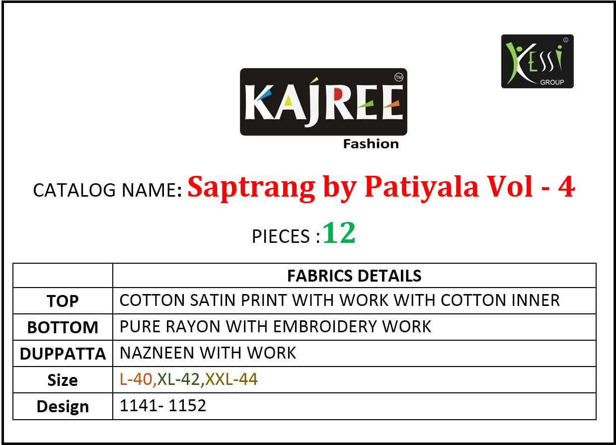 Buy Online Saptrang By Patiyala Vol 4 By Kajree Cotton Worked Patiyala Suits Wholesale Supplier India 12 Pcs of Full Catalogue at Wholesale Price. Looking for Saptrang By Patiyala Vol 4 By Kajree Cotton Worked Patiyala Suits Wholesale Supplier India Full Catalouge at Best Price? Buy Now Saptrang By Patiyala Vol 4 By Kajree Cotton Worked Patiyala Suits Wholesale Supplier India at Wholesale Rate of Rs 12660 with Total 12 Pcs from authroized dealer and supplier of KESSI Brand. Cost of Each piece is just only Rs 1055 which is very low and affordable price to resale the product in your retail store ,This is Surat based Wholesale Supplier & Dealer of KESSI Brand. Click on Brand name to Know more about KESSI Brand's products.Call or Whatsapp on 9898838984 for booking or enquiry