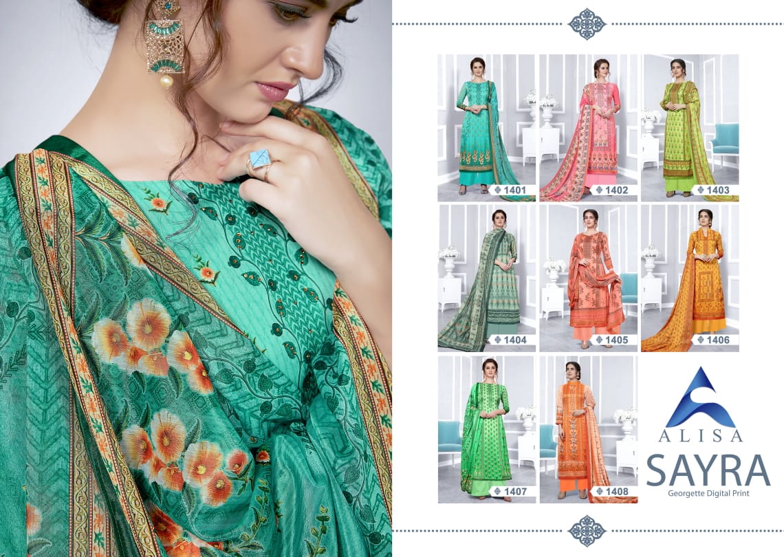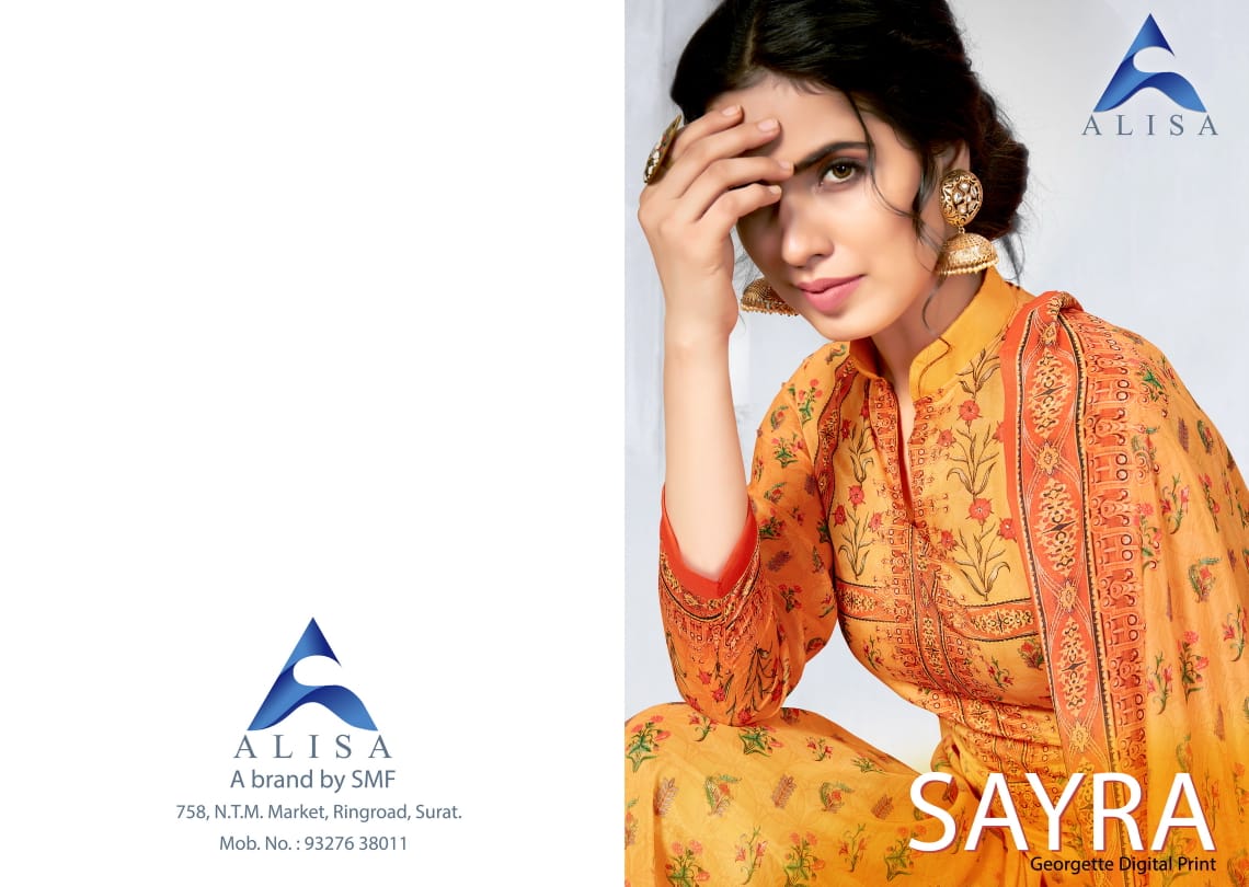 Buy Online Sayra By Alisa Georgette Suits Wholesale Supplier Gujarat 8 Pcs of Full Catalogue at Wholesale Price. Looking for Sayra By Alisa Georgette Suits Wholesale Supplier Gujarat Full Catalouge at Best Price? Buy Now Sayra By Alisa Georgette Suits Wholesale Supplier Gujarat at Wholesale Rate of Rs 5560 with Total 8 Pcs from authroized dealer and supplier of Brand. Cost of Each piece is just only Rs 695 which is very low and affordable price to resale the product in your retail store ,This is Surat based Wholesale Supplier & Dealer of Brand. Click on Brand name to Know more about Brand's products.Call or Whatsapp on 9898838984 for booking or enquiry