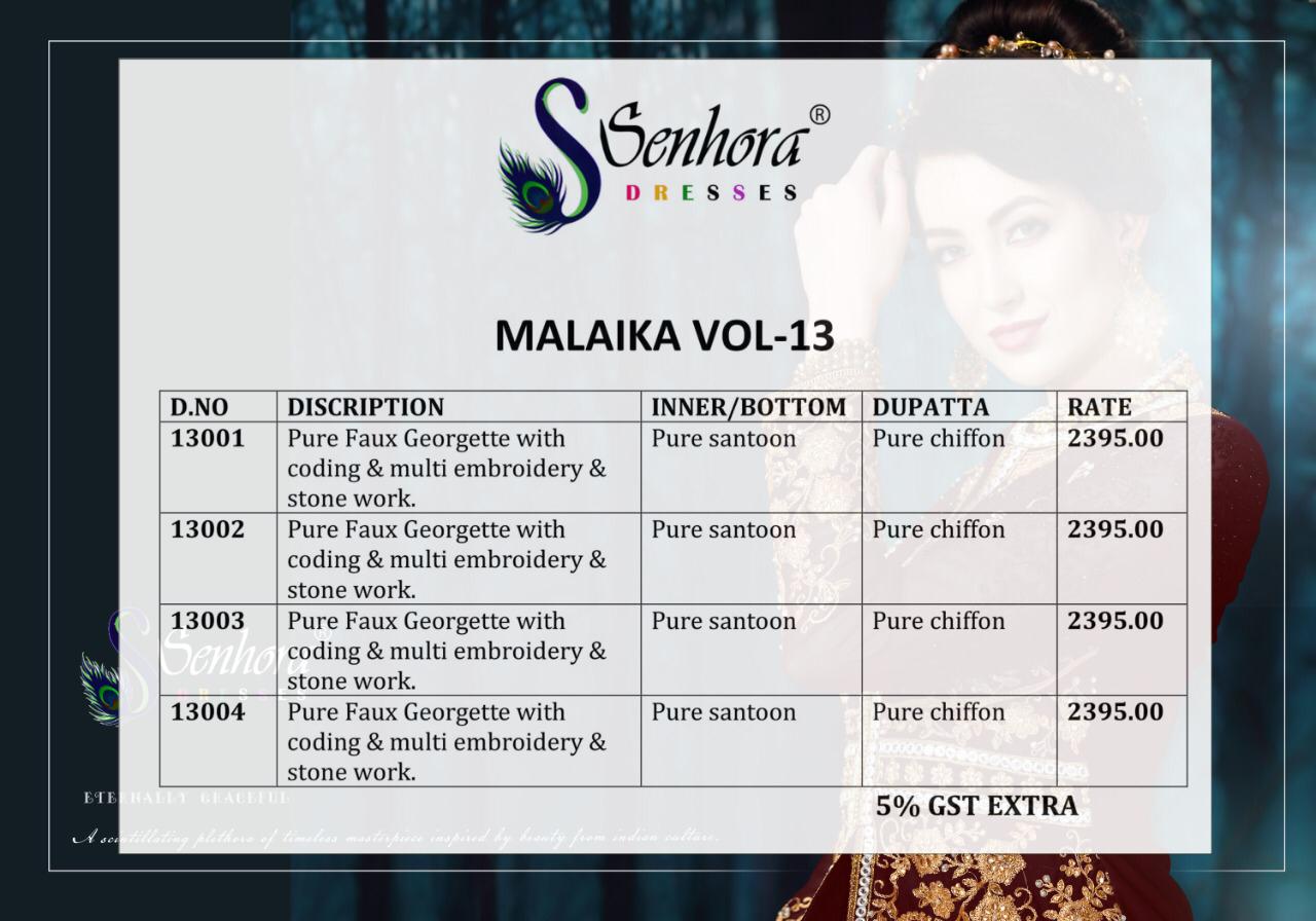 Buy Online Senhora Vol 13 Malaika Designer Party Wear Suits Set And Single Wholesale Supplier Surat 4 Pcs of Full Catalogue at Wholesale Price. Looking for Senhora Vol 13 Malaika Designer Party Wear Suits Set And Single Wholesale Supplier Surat Full Catalouge at Best Price? Buy Now Senhora Vol 13 Malaika Designer Party Wear Suits Set And Single Wholesale Supplier Surat at Wholesale Rate of Rs 9580 with Total 4 Pcs from authroized dealer and supplier of Brand. Cost of Each piece is just only Rs 2395 which is very low and affordable price to resale the product in your retail store ,This is Surat based Wholesale Supplier & Dealer of Brand. Click on Brand name to Know more about Brand's products.Call or Whatsapp on 9898838984 for booking or enquiry