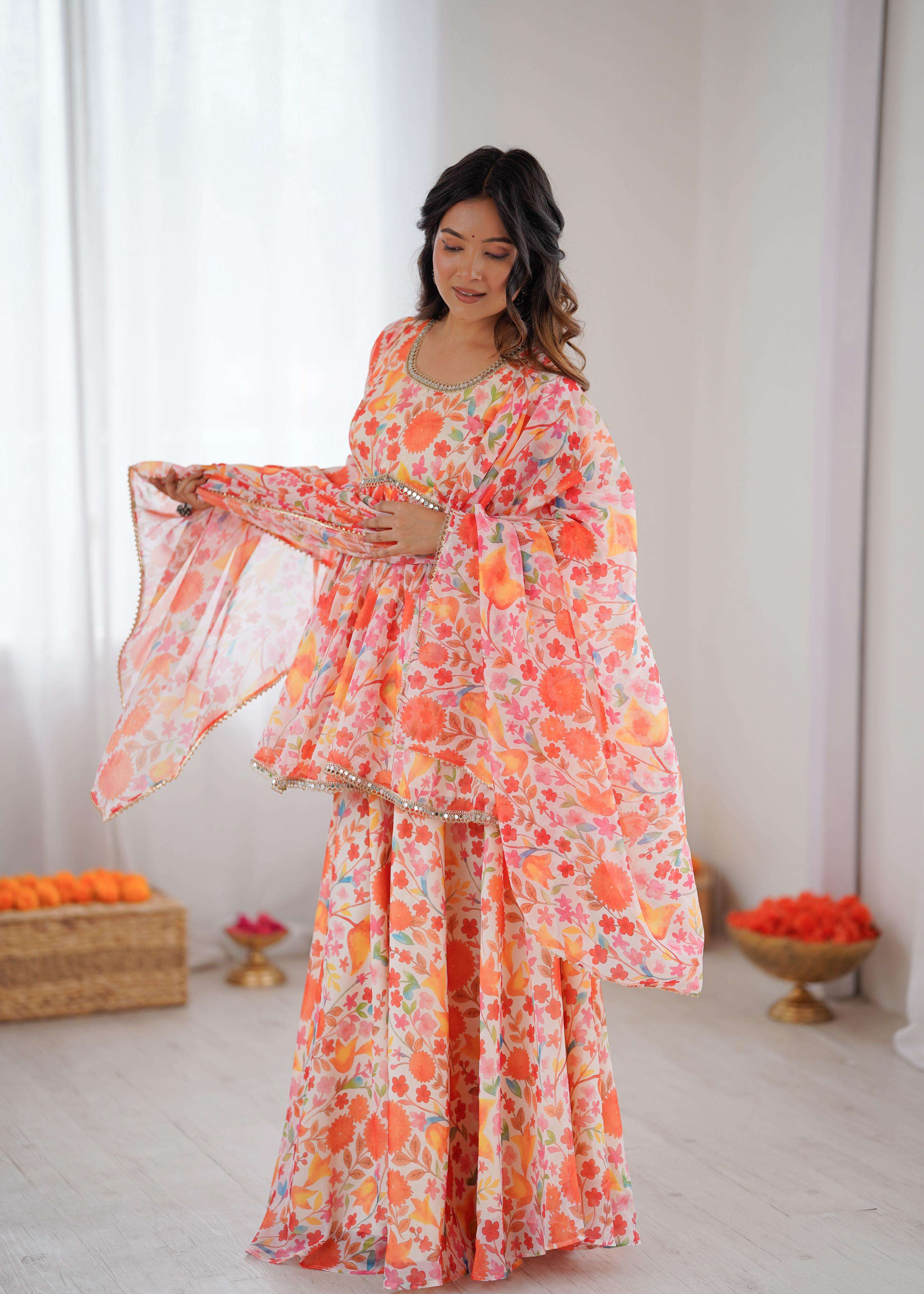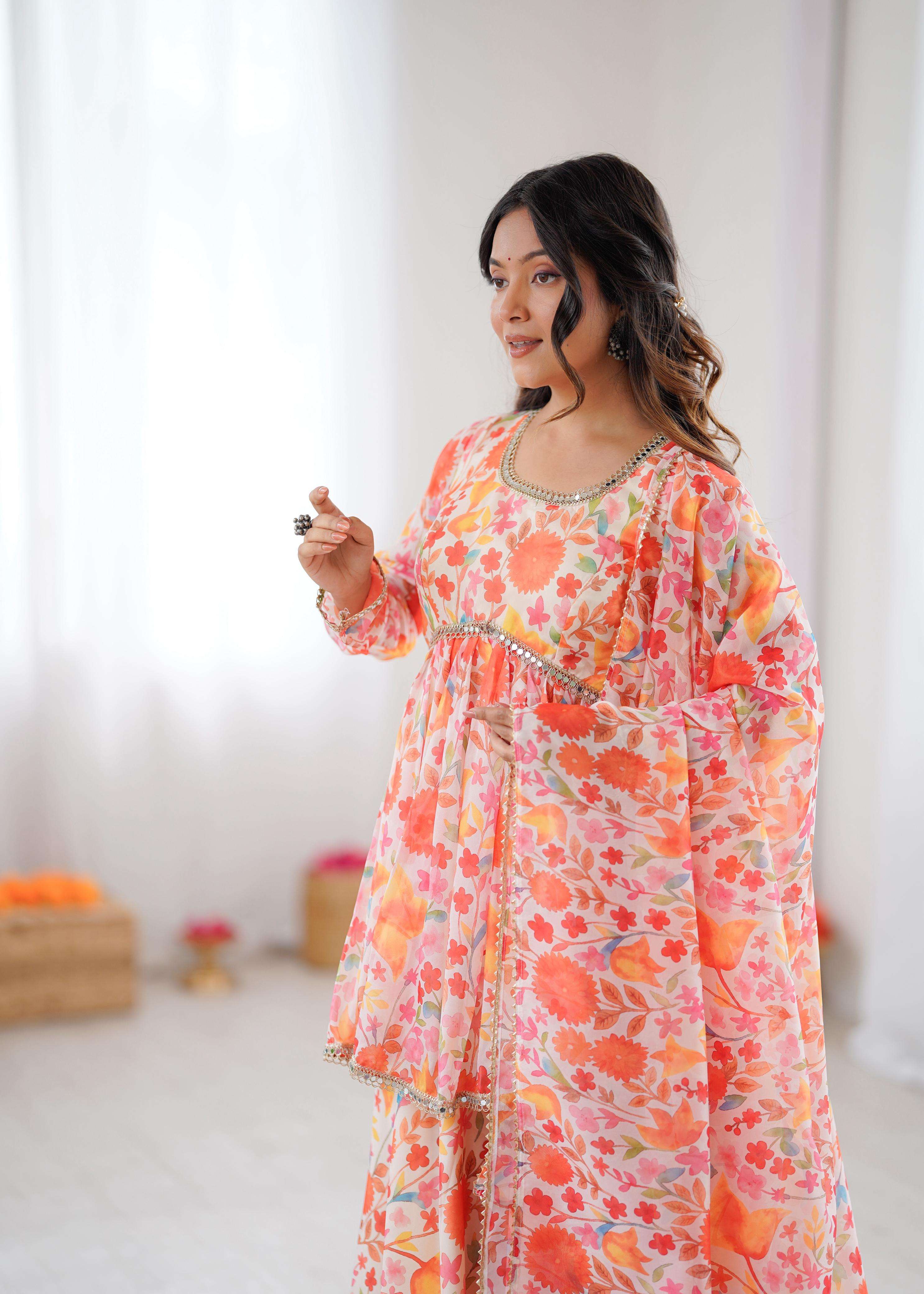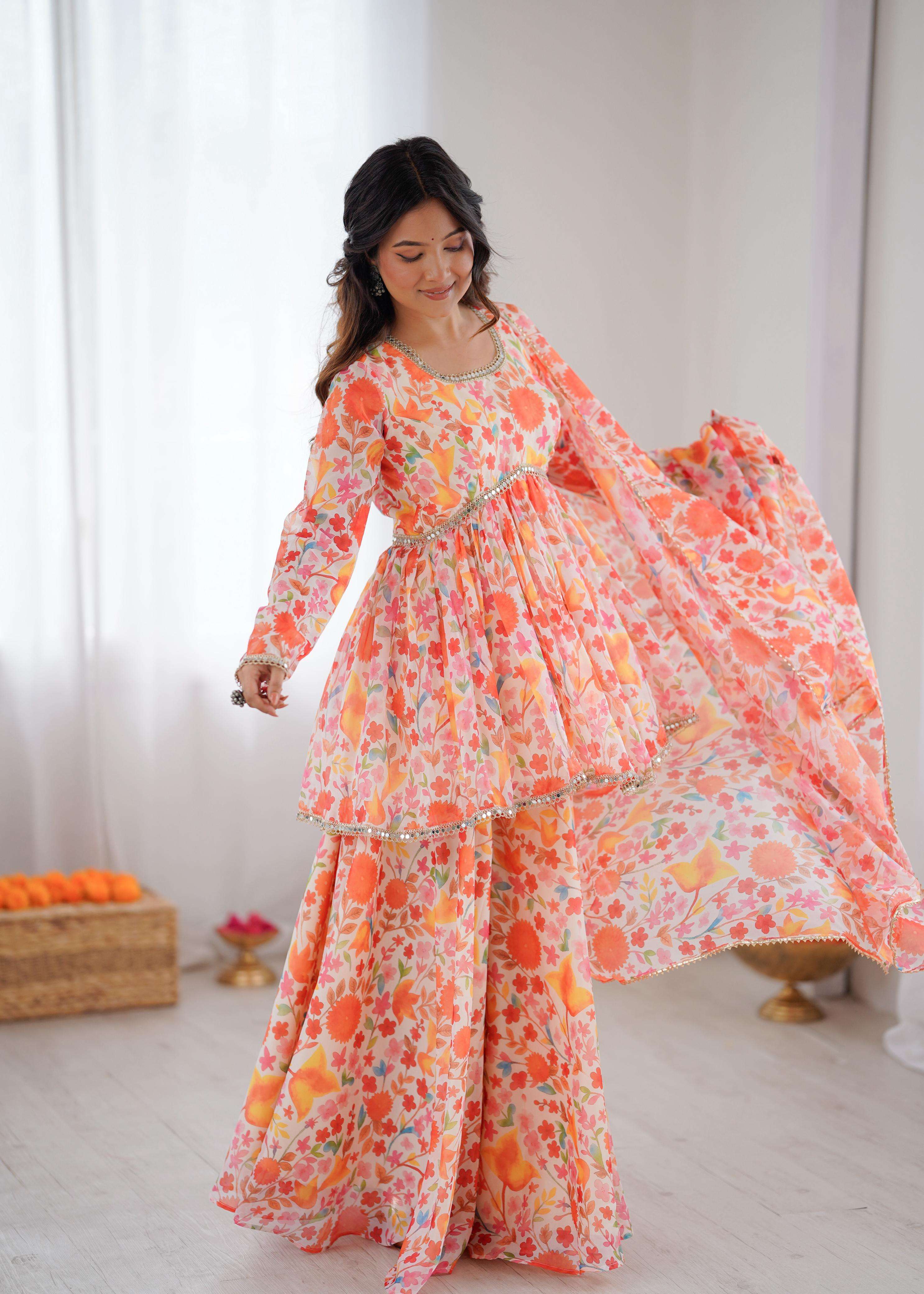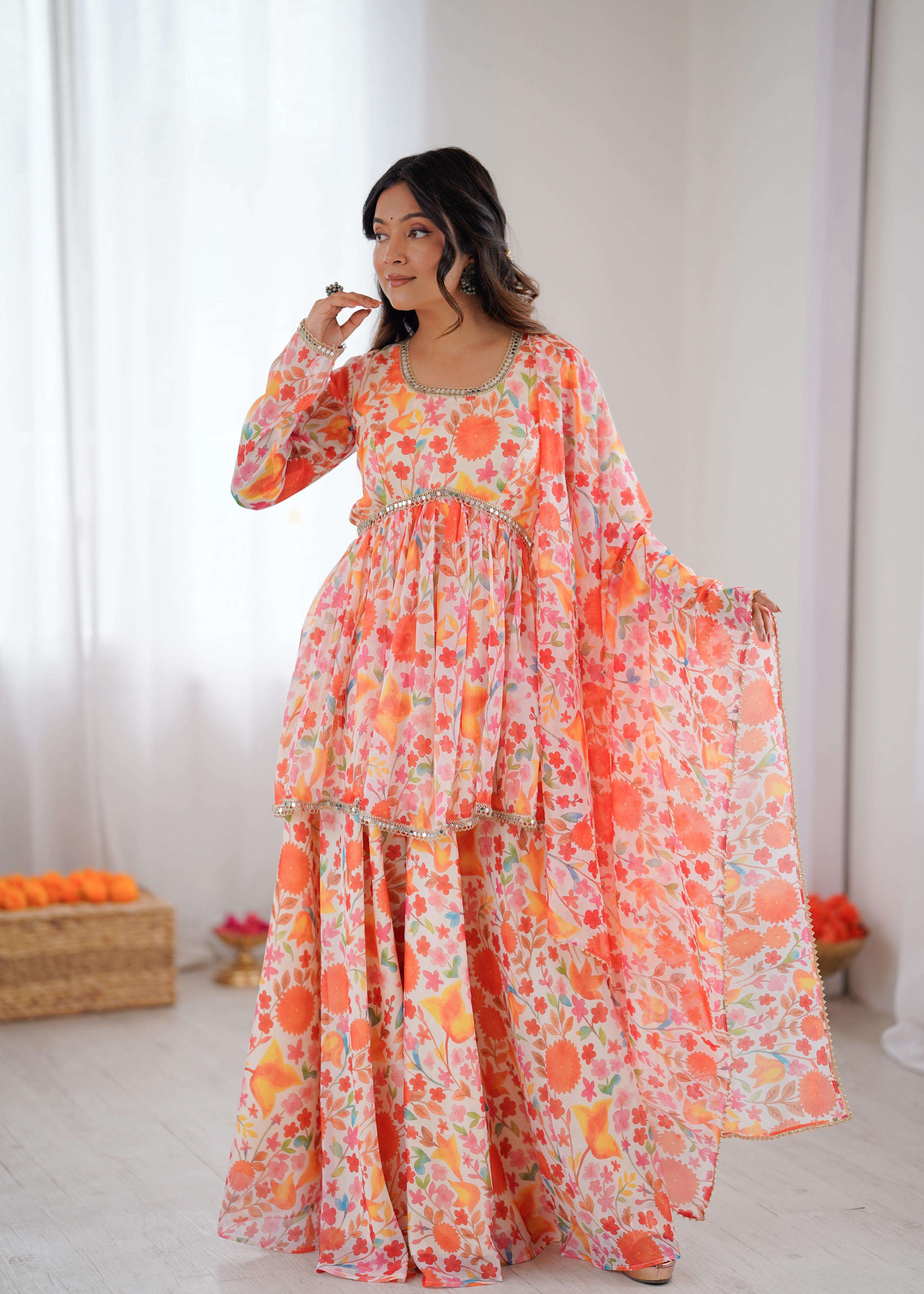 *SGF PRESENT PURE SOFT TABY ORGANZA FLORAL PRINT FABRIC FULLY FLAIR KEDIYA STYLE KURTA,WITH DUPPTA SET,PALAZZO READY TO WEAR*