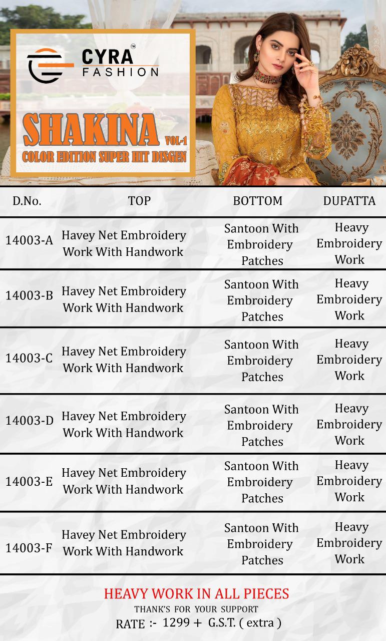 Buy Online Shakina Color Edition By Cyra Fashion Pakistani Suits Wholesale Supplier Gujarat 6 Pcs of Full Catalogue at Wholesale Price. Looking for Shakina Color Edition By Cyra Fashion Pakistani Suits Wholesale Supplier Gujarat Full Catalouge at Best Price? Buy Now Shakina Color Edition By Cyra Fashion Pakistani Suits Wholesale Supplier Gujarat at Wholesale Rate of Rs 7794 with Total 6 Pcs from authroized dealer and supplier of Brand. Cost of Each piece is just only Rs 1299 which is very low and affordable price to resale the product in your retail store ,This is Surat based Wholesale Supplier & Dealer of Brand. Click on Brand name to Know more about Brand's products.Call or Whatsapp on 9898838984 for booking or enquiry