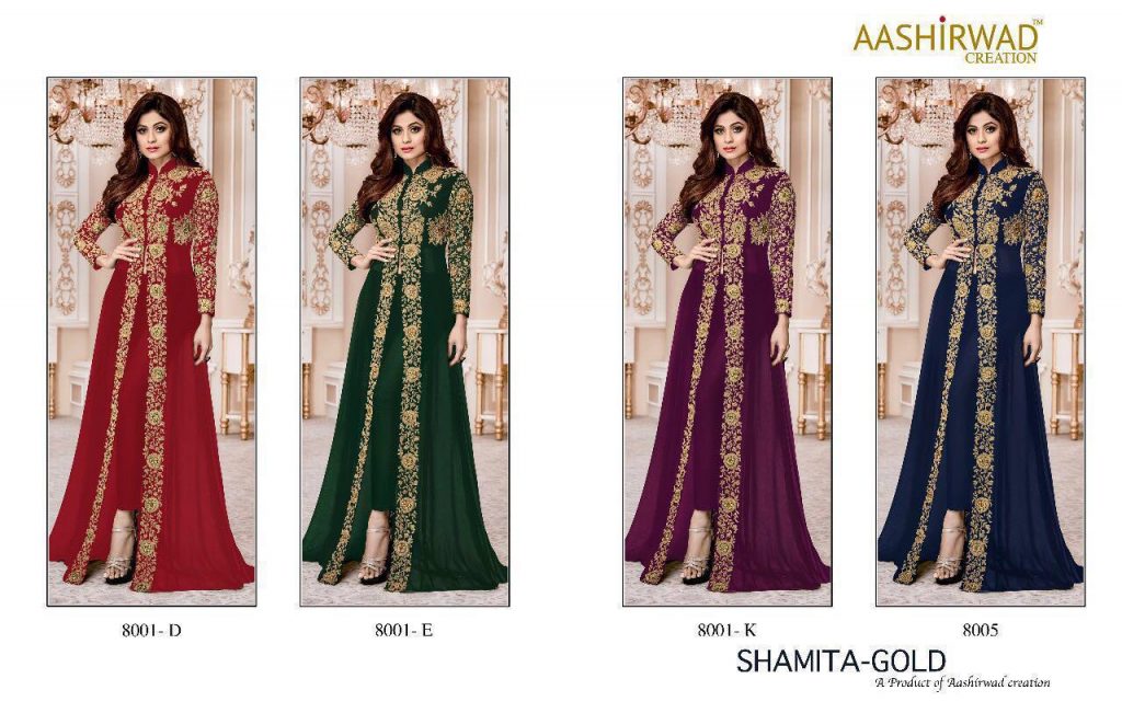 Buy Online Shamita Gold By Ashirwad Series 8001 Georgette Embroidered Designer Party Wear Suits Wholesale Supplier Gujarat 4 Pcs of Full Catalogue at Wholesale Price. Looking for Shamita Gold By Ashirwad Series 8001 Georgette Embroidered Designer Party Wear Suits Wholesale Supplier Gujarat Full Catalouge at Best Price? Buy Now Shamita Gold By Ashirwad Series 8001 Georgette Embroidered Designer Party Wear Suits Wholesale Supplier Gujarat at Wholesale Rate of Rs 7180 with Total 4 Pcs from authroized dealer and supplier of AASHIRWAD Brand. Cost of Each piece is just only Rs 1795 which is very low and affordable price to resale the product in your retail store ,This is Surat based Wholesale Supplier & Dealer of AASHIRWAD Brand. Click on Brand name to Know more about AASHIRWAD Brand's products.Call or Whatsapp on 9898838984 for booking or enquiry