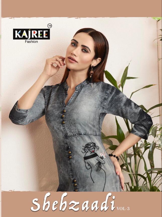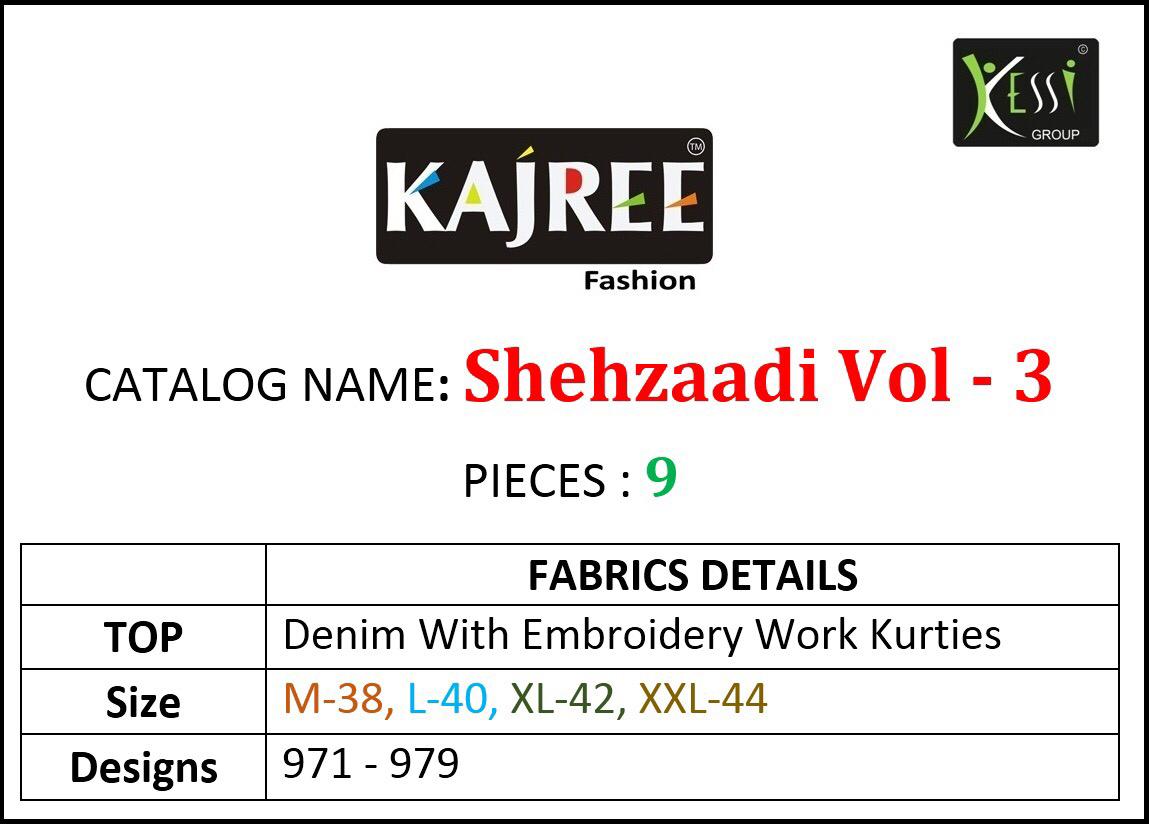 Buy Online Shehzaadi Vol 3 By Kajree 971 Series Fancy Denim Printed Kurti Catlog Wholesaler Surat 9 Pcs of Full Catalogue at Wholesale Price. Looking for Shehzaadi Vol 3 By Kajree 971 Series Fancy Denim Printed Kurti Catlog Wholesaler Surat Full Catalouge at Best Price? Buy Now Shehzaadi Vol 3 By Kajree 971 Series Fancy Denim Printed Kurti Catlog Wholesaler Surat at Wholesale Rate of Rs 5391 with Total 9 Pcs from authroized dealer and supplier of KESSI Brand. Cost of Each piece is just only Rs 599 which is very low and affordable price to resale the product in your retail store ,This is Surat based Wholesale Supplier & Dealer of KESSI Brand. Click on Brand name to Know more about KESSI Brand's products.Call or Whatsapp on 9898838984 for booking or enquiry