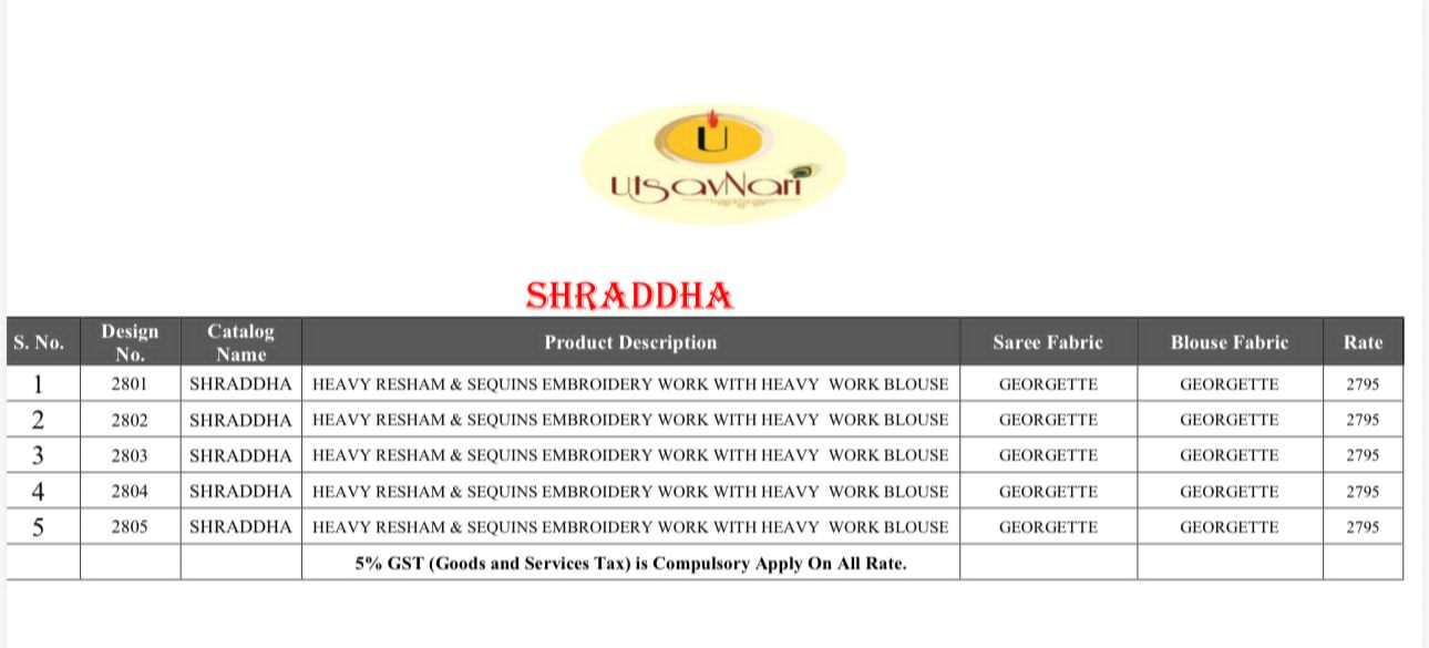 Buy Online SHRADDHA BY UTSAV NARI Saree Collection manufacturer surat 5 Pcs of Full Catalogue at Wholesale Price. Looking for SHRADDHA BY UTSAV NARI Saree Collection manufacturer surat Full Catalouge at Best Price? Buy Now SHRADDHA BY UTSAV NARI Saree Collection manufacturer surat at Wholesale Rate of Rs 13975 with Total 5 Pcs from authroized dealer and supplier of UTSAV NARI Brand. Cost of Each piece is just only Rs 2795 which is very low and affordable price to resale the product in your retail store ,This is Surat based Wholesale Supplier & Dealer of UTSAV NARI Brand. Click on Brand name to Know more about UTSAV NARI Brand's products.Call or Whatsapp on 9898838984 for booking or enquiry