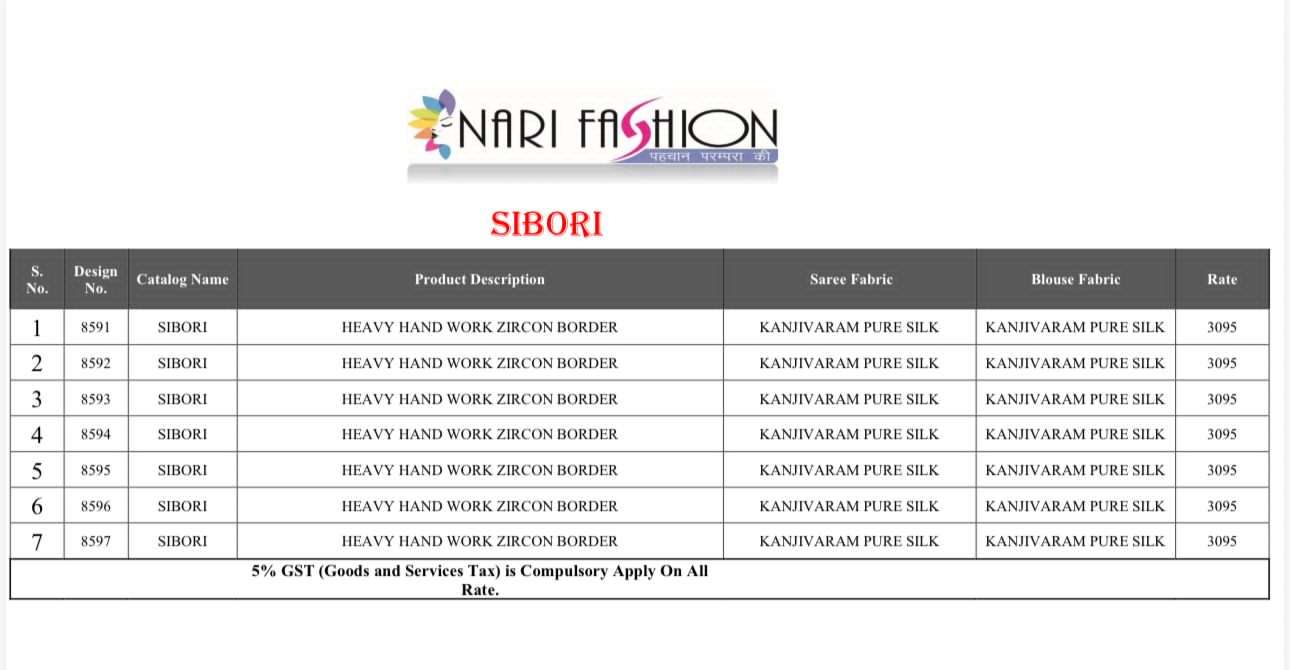 Buy Online SIBORI by nari fashion saree Collection manufacturer surat 7 Pcs of Full Catalogue at Wholesale Price. Looking for SIBORI by nari fashion saree Collection manufacturer surat Full Catalouge at Best Price? Buy Now SIBORI by nari fashion saree Collection manufacturer surat at Wholesale Rate of Rs 21665 with Total 7 Pcs from authroized dealer and supplier of Nari Fashion Brand. Cost of Each piece is just only Rs 3095 which is very low and affordable price to resale the product in your retail store ,This is Surat based Wholesale Supplier & Dealer of Nari Fashion Brand. Click on Brand name to Know more about Nari Fashion Brand's products.Call or Whatsapp on 9898838984 for booking or enquiry