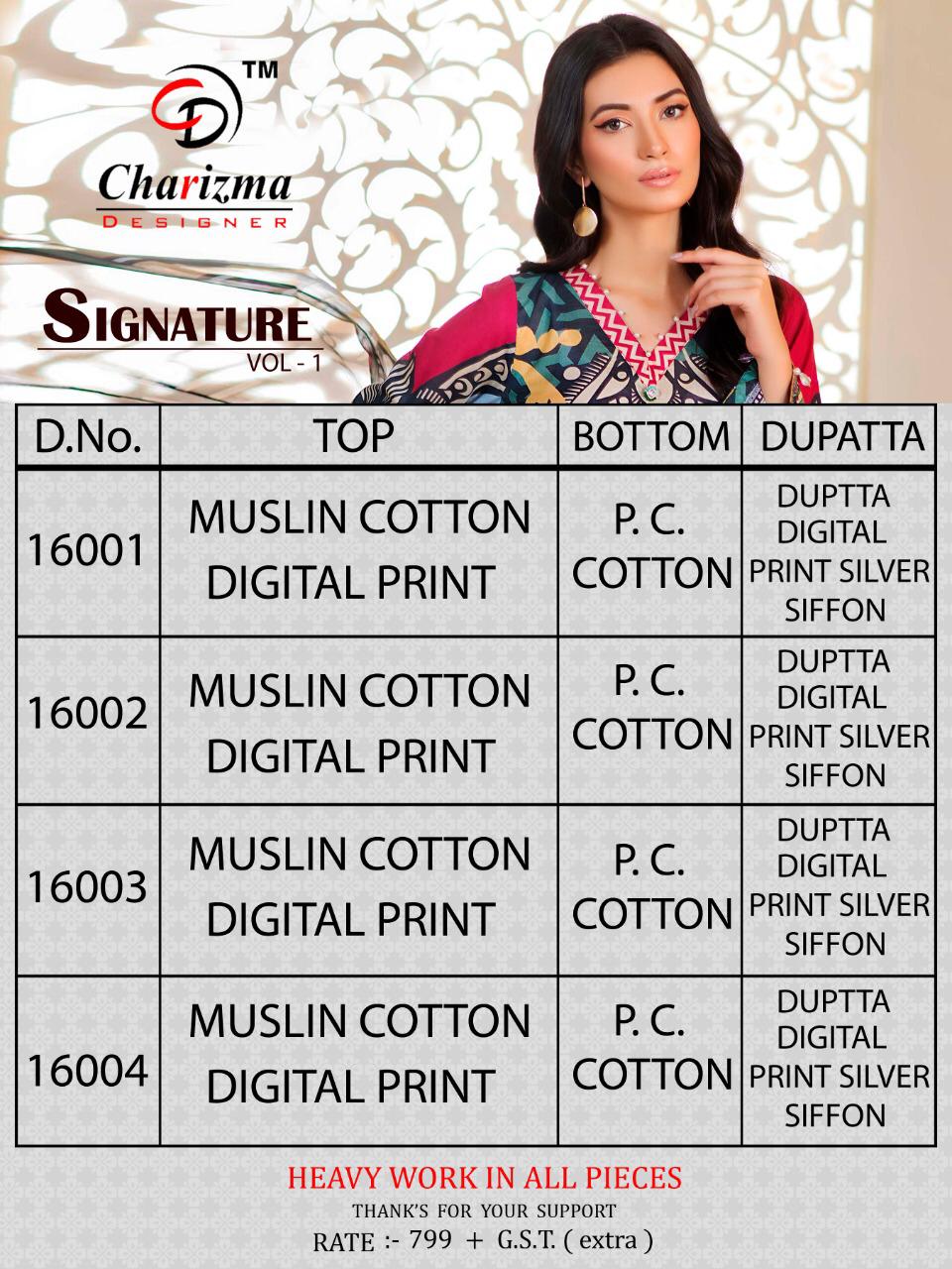 Buy Online Signature Vol 1 By Charizma Designer Pakistani Suits Wholesale Supplier Gujarat 4 Pcs of Full Catalogue at Wholesale Price. Looking for Signature Vol 1 By Charizma Designer Pakistani Suits Wholesale Supplier Gujarat Full Catalouge at Best Price? Buy Now Signature Vol 1 By Charizma Designer Pakistani Suits Wholesale Supplier Gujarat at Wholesale Rate of Rs 3196 with Total 4 Pcs from authroized dealer and supplier of Brand. Cost of Each piece is just only Rs 799 which is very low and affordable price to resale the product in your retail store ,This is Surat based Wholesale Supplier & Dealer of Brand. Click on Brand name to Know more about Brand's products.Call or Whatsapp on 9898838984 for booking or enquiry