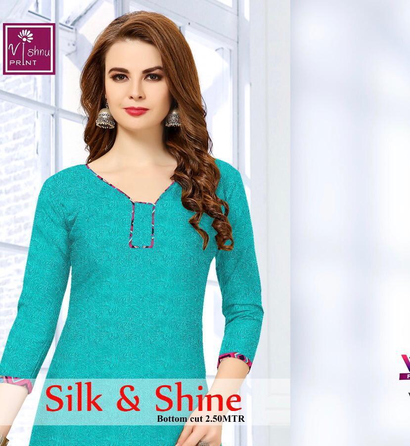 Buy Online Silk And Shine By Vishnu Cotton Dress Materials Wholesale Supplier India 12 Pcs of Full Catalogue at Wholesale Price. Looking for Silk And Shine By Vishnu Cotton Dress Materials Wholesale Supplier India Full Catalouge at Best Price? Buy Now Silk And Shine By Vishnu Cotton Dress Materials Wholesale Supplier India at Wholesale Rate of Rs 4500 with Total 12 Pcs from authroized dealer and supplier of Brand. Cost of Each piece is just only Rs 375 which is very low and affordable price to resale the product in your retail store ,This is Surat based Wholesale Supplier & Dealer of Brand. Click on Brand name to Know more about Brand's products.Call or Whatsapp on 9898838984 for booking or enquiry