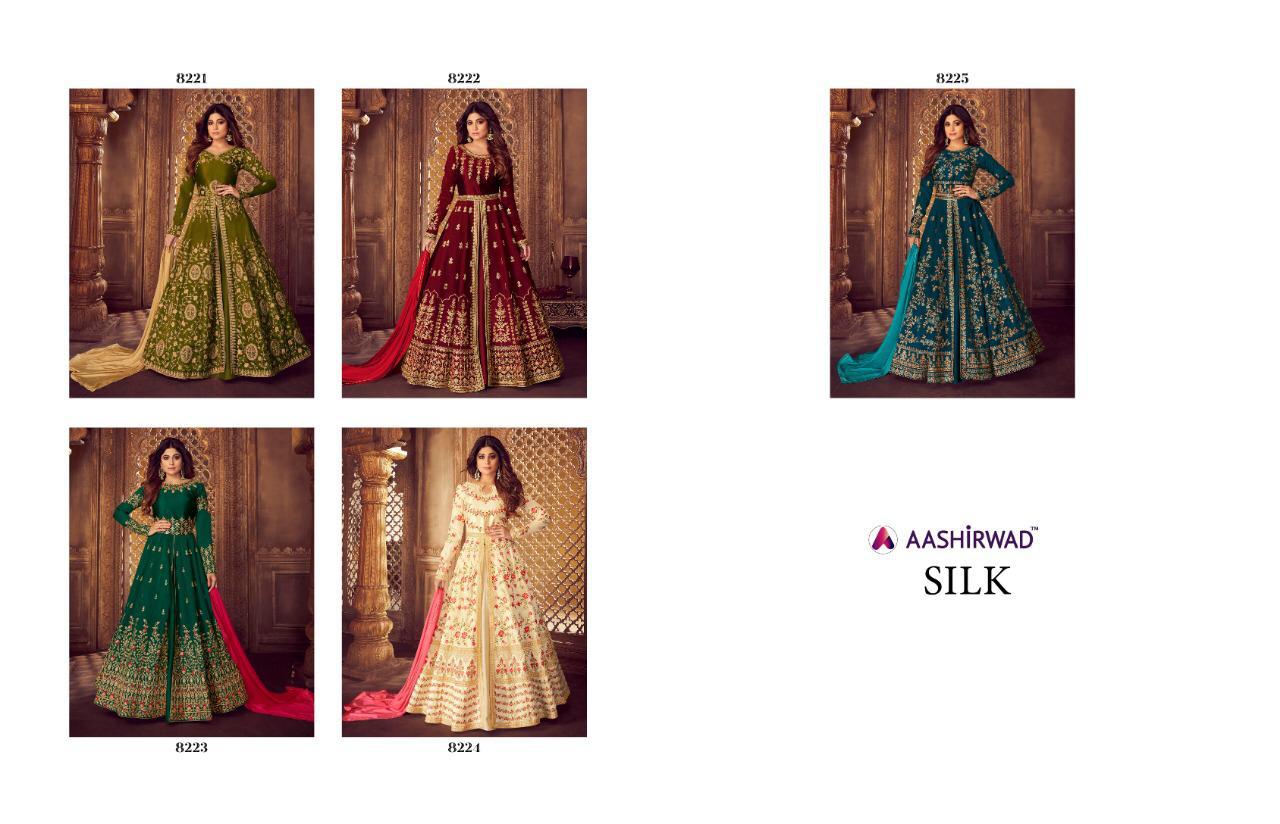 Buy Online Silk By Aashirwad Series 8221 To 8225 Designer Party Wear Suits Wholesale Supplier Gujarat 5 Pcs of Full Catalogue at Wholesale Price. Looking for Silk By Aashirwad Series 8221 To 8225 Designer Party Wear Suits Wholesale Supplier Gujarat Full Catalouge at Best Price? Buy Now Silk By Aashirwad Series 8221 To 8225 Designer Party Wear Suits Wholesale Supplier Gujarat at Wholesale Rate of Rs 12475 with Total 5 Pcs from authroized dealer and supplier of AASHIRWAD Brand. Cost of Each piece is just only Rs 2495 which is very low and affordable price to resale the product in your retail store ,This is Surat based Wholesale Supplier & Dealer of AASHIRWAD Brand. Click on Brand name to Know more about AASHIRWAD Brand's products.Call or Whatsapp on 9898838984 for booking or enquiry
