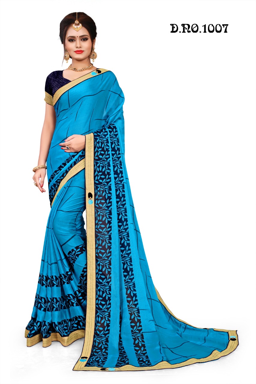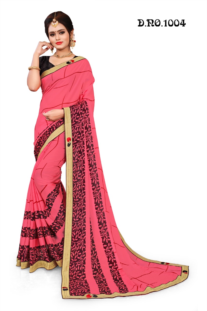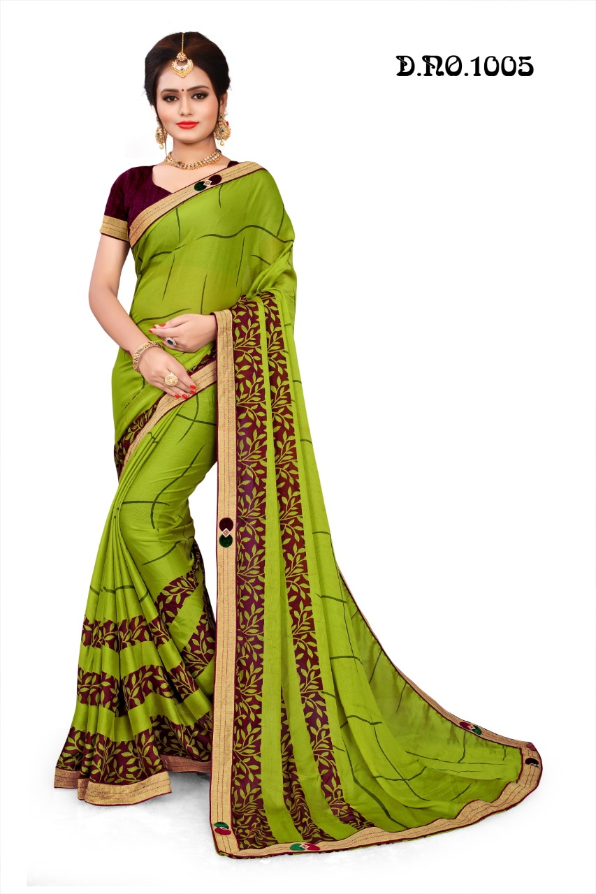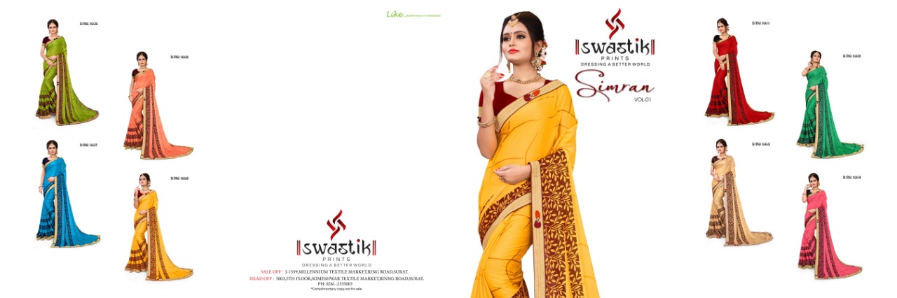 ****** *??NAMASTE??* ****** *SWASTIK PRINTS* *"DRESSING A BETTER WORLD"* *A Unit of Nandini sarees Llp, Surat* ?Poster ; *Simran VOL.1 ,* Printed Designer Sarees with Exclusive Border. Fabric; *CHINA CIFFON* *8 COLOUR MATCHING per set*., ?Packing; *_Box Packing_* , Rate?; *(425 Net No less????)?5? % G.S.T* |