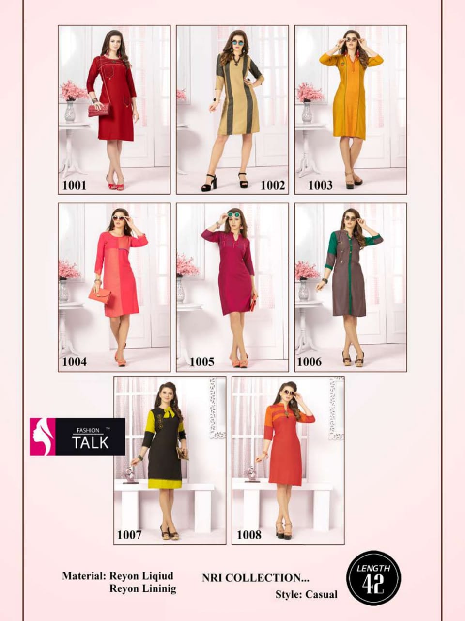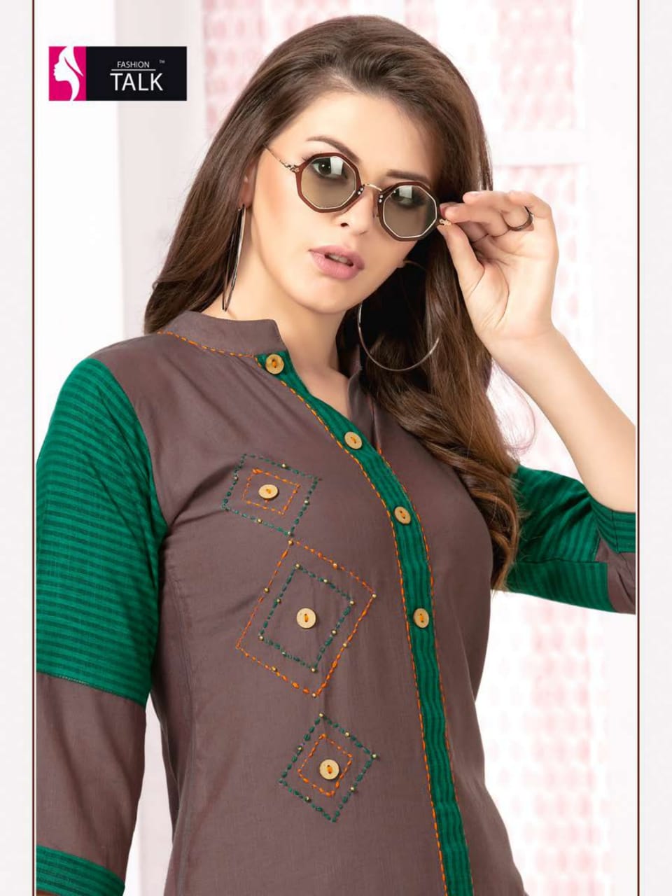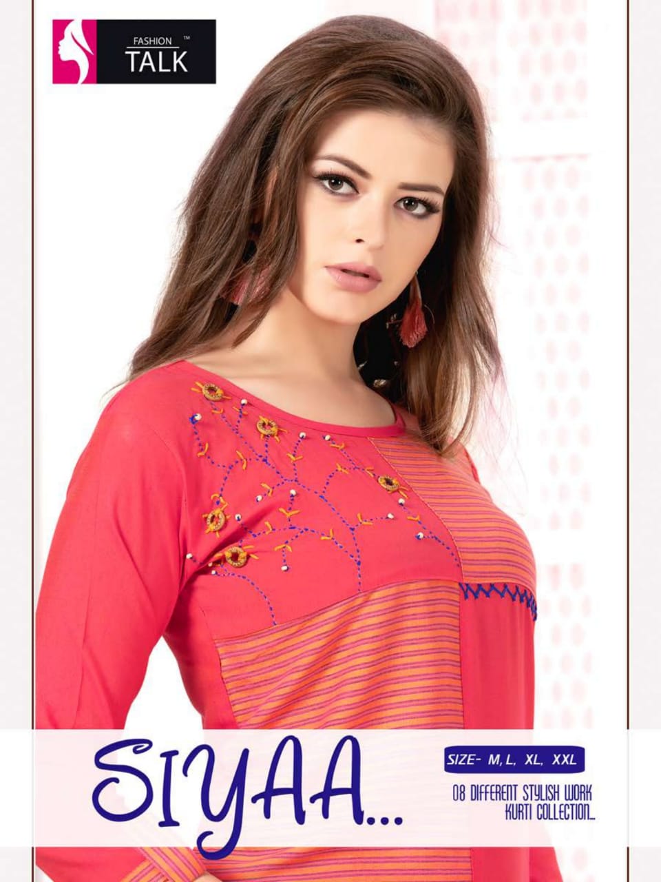 Buy Online Siyaa By Fashion Talk Reyon Kurtis Wholesale Supplier And Dealer Surat 8 Pcs of Full Catalogue at Wholesale Price. Looking for Siyaa By Fashion Talk Reyon Kurtis Wholesale Supplier And Dealer Surat Full Catalouge at Best Price? Buy Now Siyaa By Fashion Talk Reyon Kurtis Wholesale Supplier And Dealer Surat at Wholesale Rate of Rs 2760 with Total 8 Pcs from authroized dealer and supplier of BRAND'S Brand. Cost of Each piece is just only Rs 345 which is very low and affordable price to resale the product in your retail store ,This is Surat based Wholesale Supplier & Dealer of BRAND'S Brand. Click on Brand name to Know more about BRAND'S Brand's products.Call or Whatsapp on 9898838984 for booking or enquiry