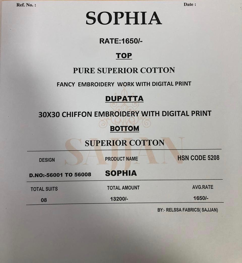 Buy Online Sophia By Relisha Series 56001 Designer Party Wear Suits Wholesale Supplier Gujarat 8 Pcs of Full Catalogue at Wholesale Price. Looking for Sophia By Relisha Series 56001 Designer Party Wear Suits Wholesale Supplier Gujarat Full Catalouge at Best Price? Buy Now Sophia By Relisha Series 56001 Designer Party Wear Suits Wholesale Supplier Gujarat at Wholesale Rate of Rs 13200 with Total 8 Pcs from authroized dealer and supplier of Brand. Cost of Each piece is just only Rs 1650 which is very low and affordable price to resale the product in your retail store ,This is Surat based Wholesale Supplier & Dealer of Brand. Click on Brand name to Know more about Brand's products.Call or Whatsapp on 9898838984 for booking or enquiry