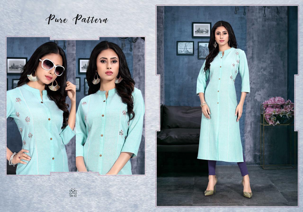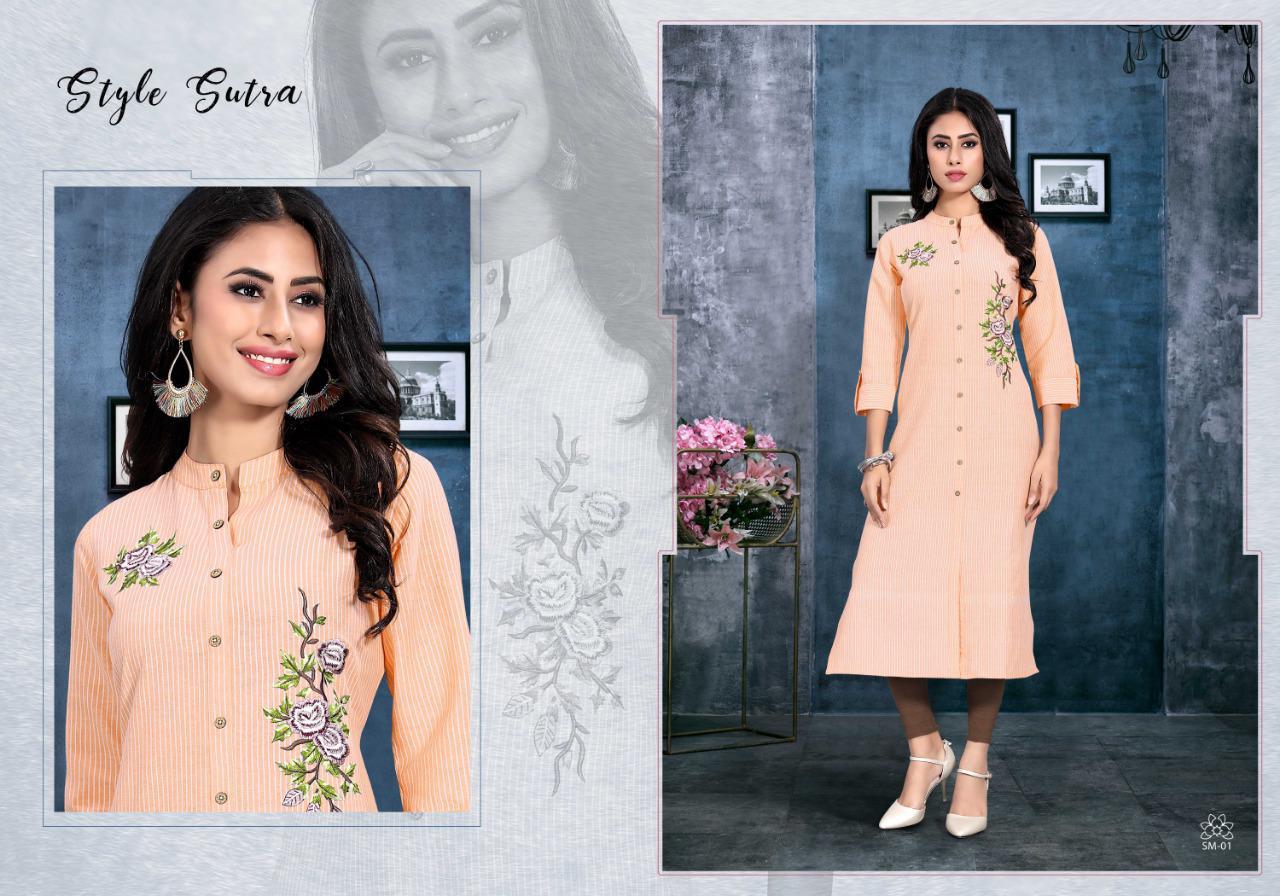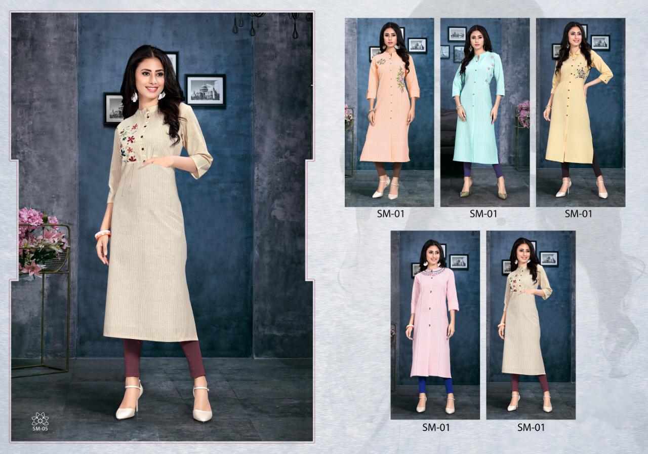 *STF - Kurties* _Launches_ _Summer Collection_ _Catalogue_ :- *Style Mantra* _(```Embroidered Pure Cotton Straight Cut Kurtis```)_ _Fabrics_ :- * Pure Cotton Stripes* _Length_ :- * 45Â?* Flare :- Straight Cut _Bag_ :- *5 Pieces* _Sizes_ :- *M - 38*; *L - 40*; *XL - 42*; *2XL - 44* _Price_ :- *?440/-* _plus_ *5% GST* _Delivery - Today . Set To Set . |