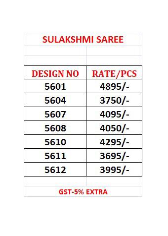Buy Online Sulkashmi All Hits Series 5601 Fancy Sarees Set And Single Wholesale Supplier And Dealer Surat 0 Pcs of Full Catalogue at Wholesale Price. Looking for Sulkashmi All Hits Series 5601 Fancy Sarees Set And Single Wholesale Supplier And Dealer Surat Full Catalouge at Best Price? Buy Now Sulkashmi All Hits Series 5601 Fancy Sarees Set And Single Wholesale Supplier And Dealer Surat at Wholesale Rate of Rs 0 with Total 0 Pcs from authroized dealer and supplier of BRAND'S Brand. Cost of Each piece is just only Rs 0 which is very low and affordable price to resale the product in your retail store ,This is Surat based Wholesale Supplier & Dealer of BRAND'S Brand. Click on Brand name to Know more about BRAND'S Brand's products.Call or Whatsapp on 9898838984 for booking or enquiry