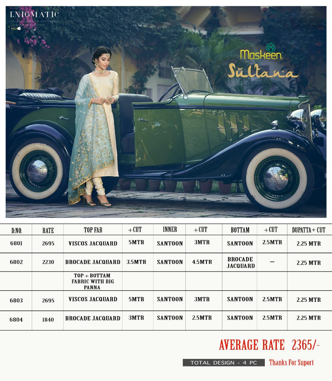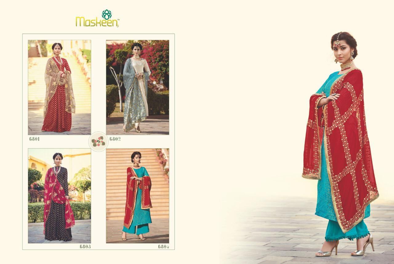 Buy Online Sultana By Maskeen Maisha 6801 Series Fancy Designer Party Wear Gown Suit Collection Wholesaler Surat 4 Pcs of Full Catalogue at Wholesale Price. Looking for Sultana By Maskeen Maisha 6801 Series Fancy Designer Party Wear Gown Suit Collection Wholesaler Surat Full Catalouge at Best Price? Buy Now Sultana By Maskeen Maisha 6801 Series Fancy Designer Party Wear Gown Suit Collection Wholesaler Surat at Wholesale Rate of Rs 9460 with Total 4 Pcs from authroized dealer and supplier of MAISHA Brand. Cost of Each piece is just only Rs 2365 which is very low and affordable price to resale the product in your retail store ,This is Surat based Wholesale Supplier & Dealer of MAISHA Brand. Click on Brand name to Know more about MAISHA Brand's products.Call or Whatsapp on 9898838984 for booking or enquiry