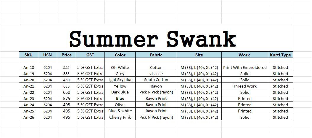 Brand - ANYUKA. Catlog name - SUMMER SWANK . Set & Loose & Singel. Single Extra 100 on company price list GST 5 Percent Extra. Delivery 2 days |