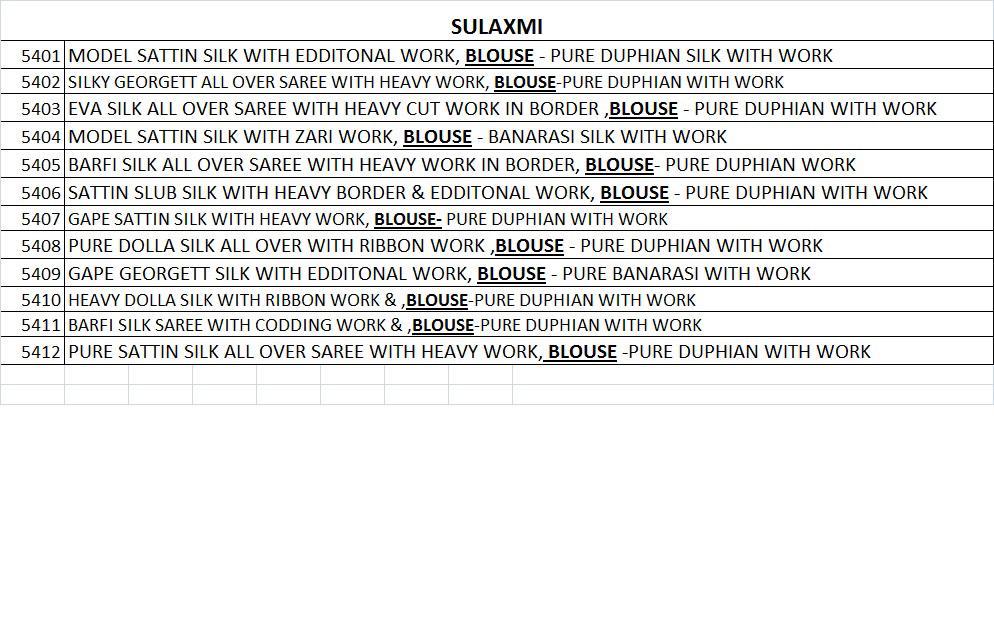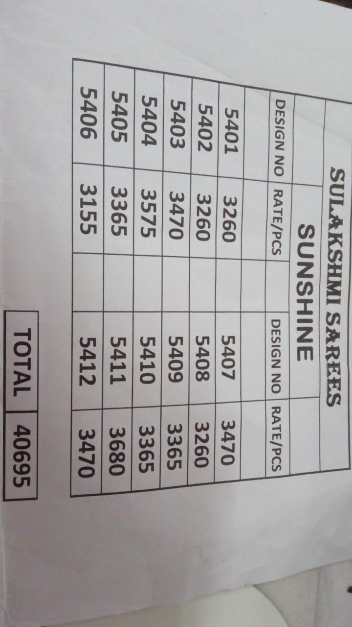 Buy Online Sunshine By Sulakshmi 5401 Series Fancy Designer Party Wear Saree Collection Wholesaler Surat 12 Pcs of Full Catalogue at Wholesale Price. Looking for Sunshine By Sulakshmi 5401 Series Fancy Designer Party Wear Saree Collection Wholesaler Surat Full Catalouge at Best Price? Buy Now Sunshine By Sulakshmi 5401 Series Fancy Designer Party Wear Saree Collection Wholesaler Surat at Wholesale Rate of Rs 0 with Total 12 Pcs from authroized dealer and supplier of Brand. Cost of Each piece is just only Rs 0 which is very low and affordable price to resale the product in your retail store ,This is Surat based Wholesale Supplier & Dealer of Brand. Click on Brand name to Know more about Brand's products.Call or Whatsapp on 9898838984 for booking or enquiry