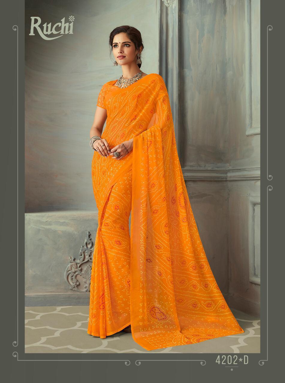 *LOOSE PCS AVAILABLE* *RUCHI SAREE* CATALOG Name - *SUPER KESAR CHIFFON* ( BANDHNI). *HIT DESIGN COLLECTION* *Fabric- Chiifon* *Rate Â? 360 /- per Pcs* *SINGLE SINGLE AVAILABLE* Weight per pcs 390 Gram per saree ( Approx ) Single Extra 100 GST 5 Percent Extra *READY TO SHIP* BOOK YOUR ORDER NOW |