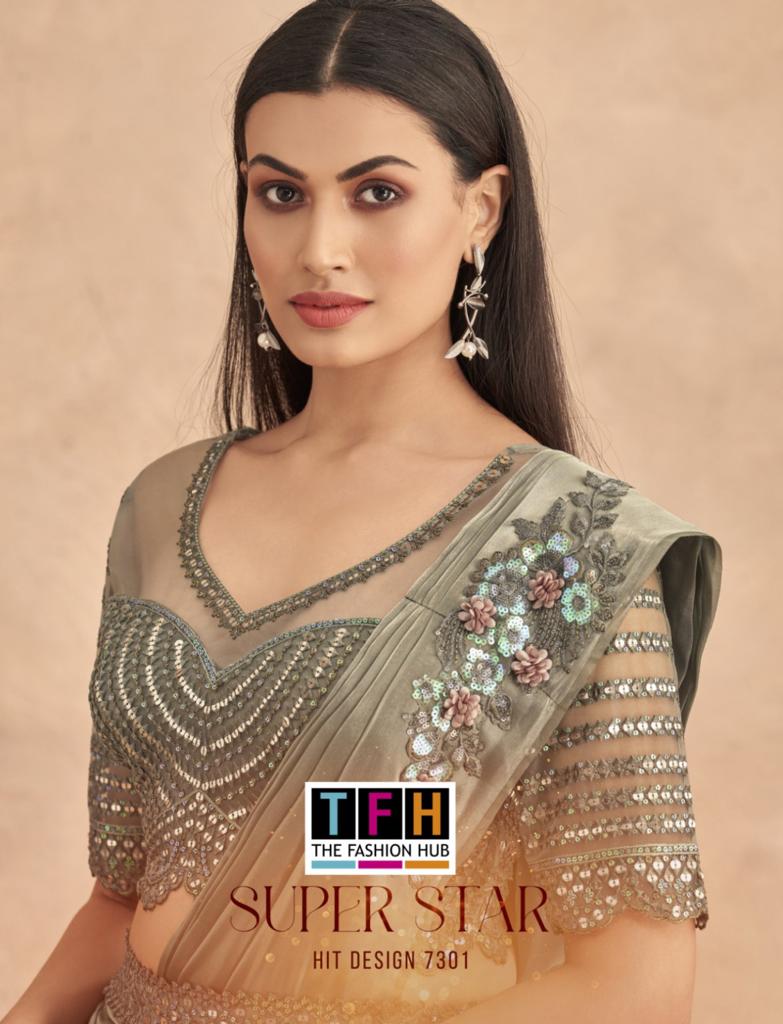 BRAND NAME Â? *TFH* CATALOG NAME Â? SUPER STAR 7301 COLOURÂ?S SERIES Â? 7301A TO 7301F PCS Â? 6 FANCY SAREE WITH BELT RATE Â? 2550/- PER PCS GST EXTRA SINGLE AVAILABLE BOOK YOUR ORDER NOW 100+single |