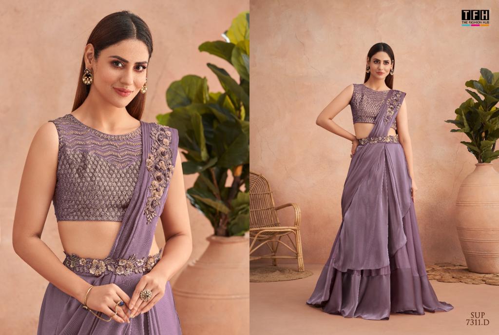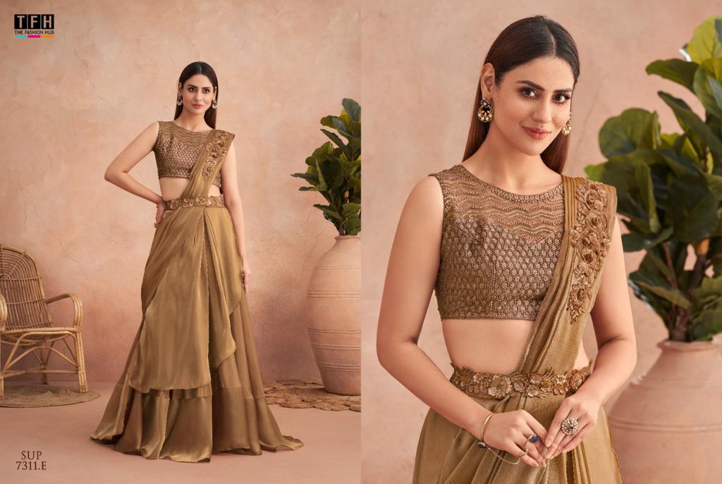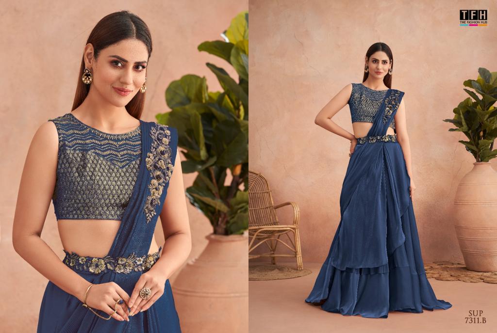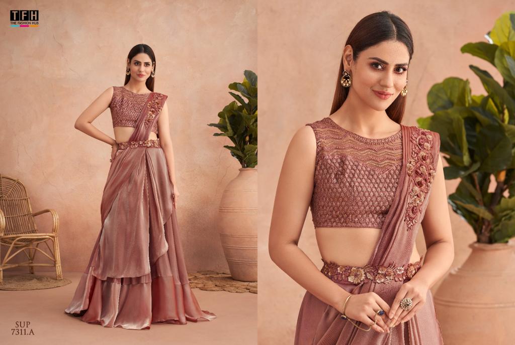 BRAND NAME Â? *TFH* CATALOG NAME Â? SUPER STAR 7311 COLOURÂ?S SERIES Â? 7311A TO 7311F PCS Â? 6 FANCY SAREE WITH BELT RATE - 2361/- PER PCS GST EXTRA SINGLE AVAILABLE BOOK YOUR ORDER NOW 100+Singles |