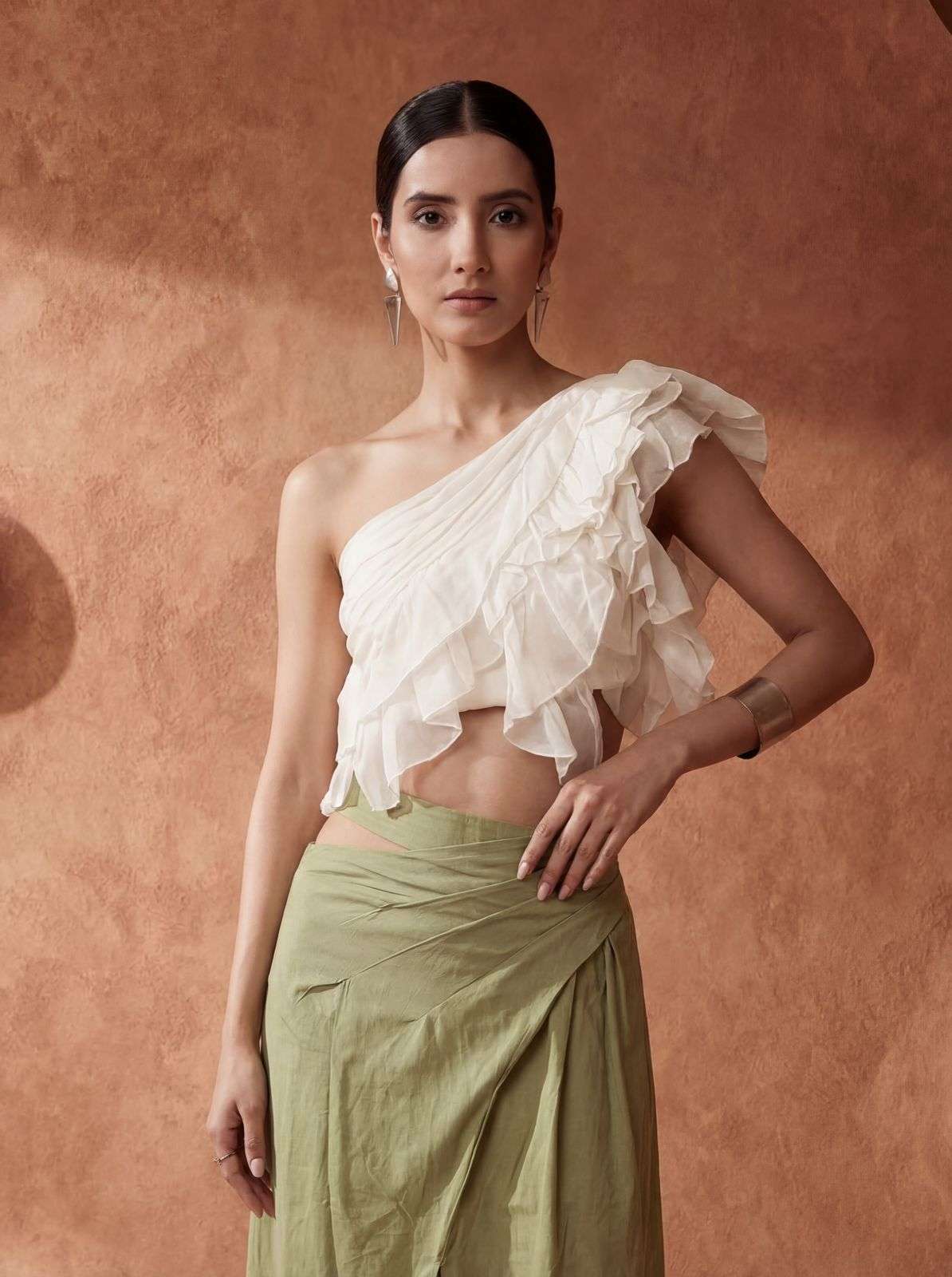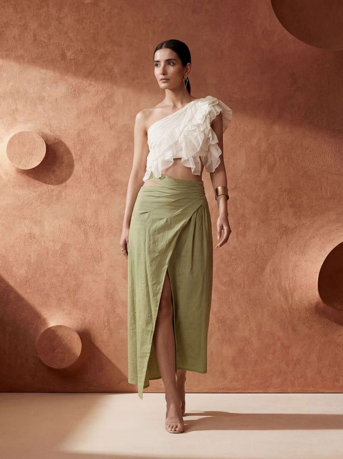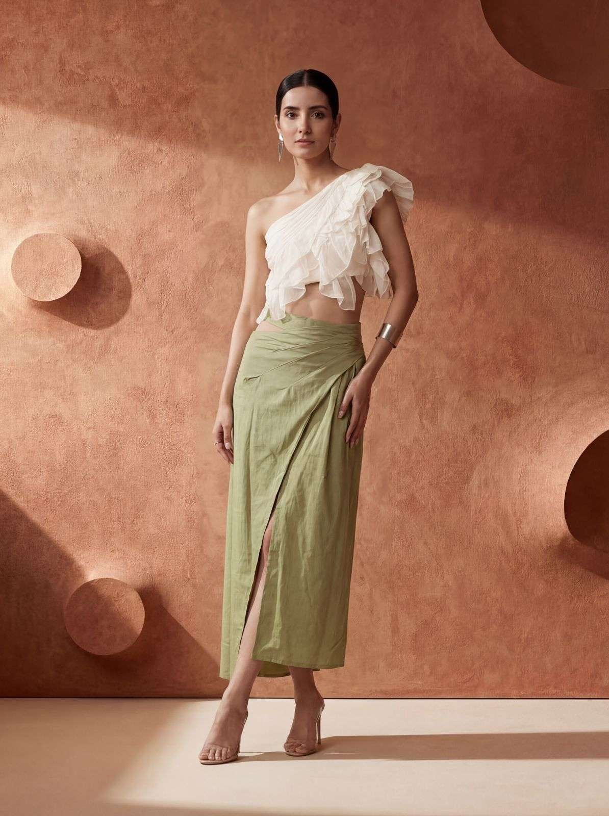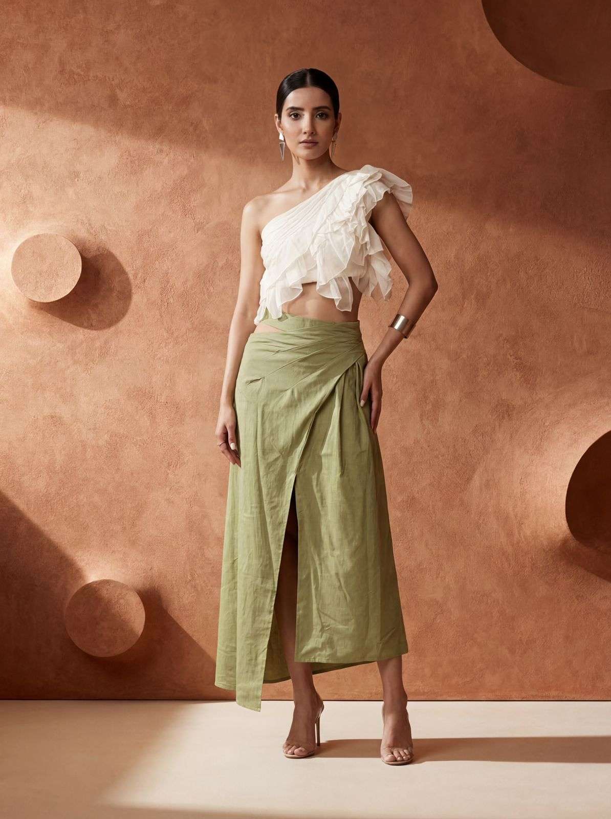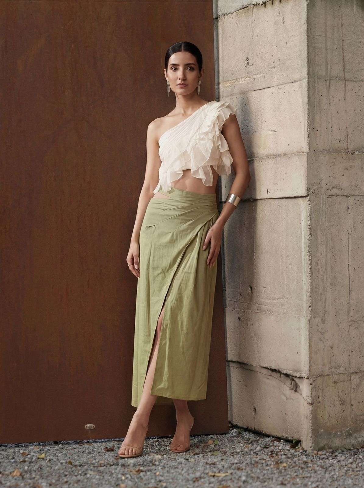 Yellow Ruffled One Shoulder Top with bottole Green Cotton long SkirtCo ord set Yellow one-shoulder ruffled top paired with fancy cotton green long skirt."Fabric: soft, breathable cotton satin with organza ruffles and khadi skirt ,gentle on skin, ideal for all-day comfort. Details: 3D applique, floral appliqués crafted from premiumorganza for a refined finish. |