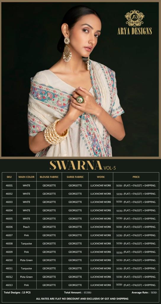Buy Online Swarna Vol 5 By Arya Designs Fancy Stylish Wear Saree Collection Manufacturer Surat 13 Pcs of Full Catalogue at Wholesale Price. Looking for Swarna Vol 5 By Arya Designs Fancy Stylish Wear Saree Collection Manufacturer Surat Full Catalouge at Best Price? Buy Now Swarna Vol 5 By Arya Designs Fancy Stylish Wear Saree Collection Manufacturer Surat at Wholesale Rate of Rs 65390 with Total 13 Pcs from authroized dealer and supplier of ARYA DESIGNS Brand. Cost of Each piece is just only Rs 5030 which is very low and affordable price to resale the product in your retail store ,This is Surat based Wholesale Supplier & Dealer of ARYA DESIGNS Brand. Click on Brand name to Know more about ARYA DESIGNS Brand's products.Call or Whatsapp on 9898838984 for booking or enquiry