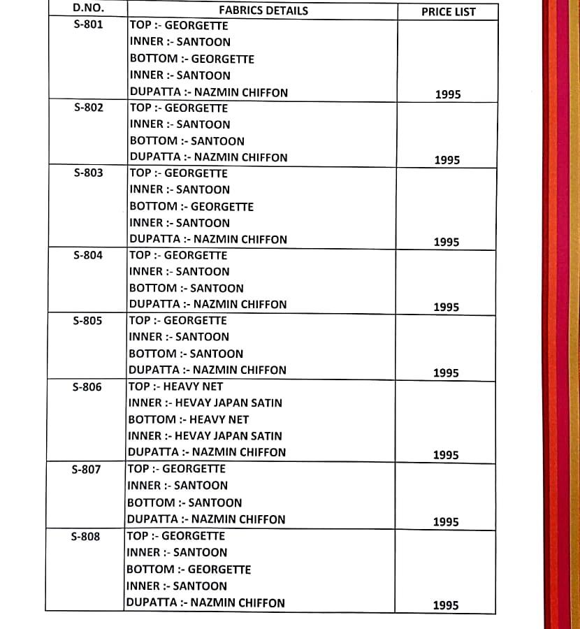 Buy Online Sybella Series S 801 To S 808 Georgette Designer Suits Wholesale Supplier Surat 8 Pcs of Full Catalogue at Wholesale Price. Looking for Sybella Series S 801 To S 808 Georgette Designer Suits Wholesale Supplier Surat Full Catalouge at Best Price? Buy Now Sybella Series S 801 To S 808 Georgette Designer Suits Wholesale Supplier Surat at Wholesale Rate of Rs 15960 with Total 8 Pcs from authroized dealer and supplier of SYBELLA Brand. Cost of Each piece is just only Rs 1995 which is very low and affordable price to resale the product in your retail store ,This is Surat based Wholesale Supplier & Dealer of SYBELLA Brand. Click on Brand name to Know more about SYBELLA Brand's products.Call or Whatsapp on 9898838984 for booking or enquiry