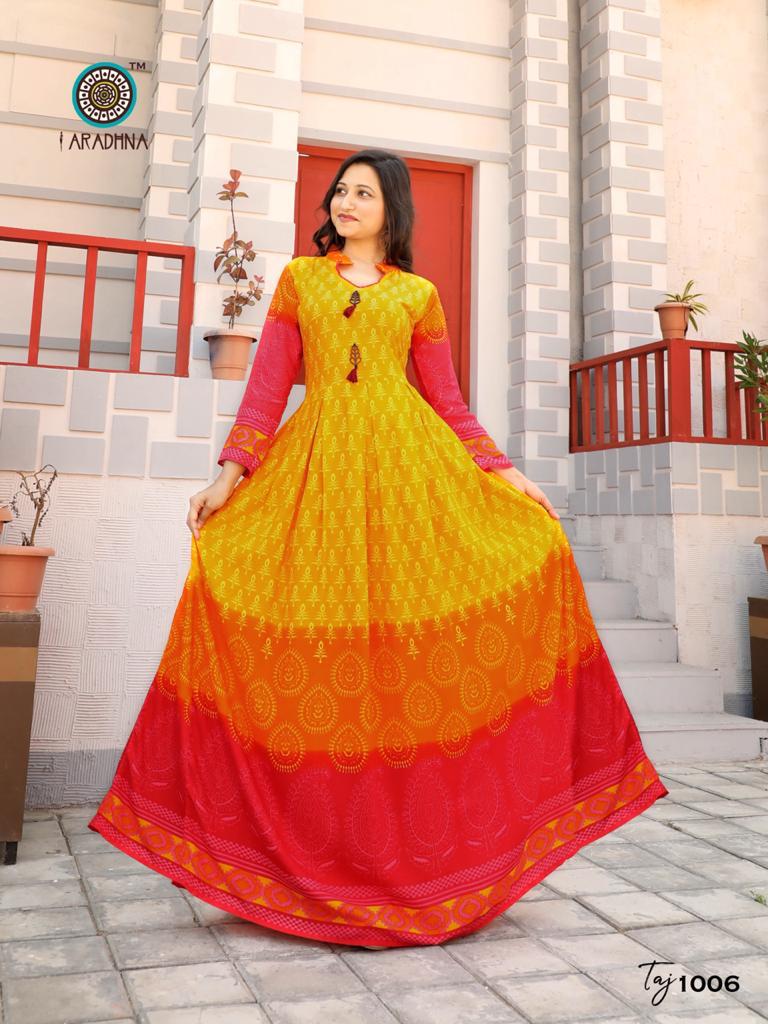 Buy Online Taj Vol 3 By Aradhana Kurtis Wholesale Supplier And Dealer Surat 9 Pcs of Full Catalogue at Wholesale Price. Looking for Taj Vol 3 By Aradhana Kurtis Wholesale Supplier And Dealer Surat Full Catalouge at Best Price? Buy Now Taj Vol 3 By Aradhana Kurtis Wholesale Supplier And Dealer Surat at Wholesale Rate of Rs 5850 with Total 9 Pcs from authroized dealer and supplier of BRAND'S Brand. Cost of Each piece is just only Rs 650 which is very low and affordable price to resale the product in your retail store ,This is Surat based Wholesale Supplier & Dealer of BRAND'S Brand. Click on Brand name to Know more about BRAND'S Brand's products.Call or Whatsapp on 9898838984 for booking or enquiry