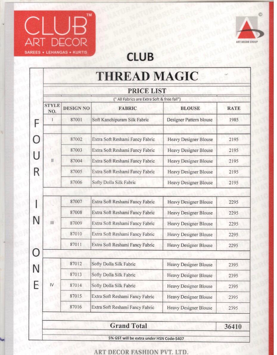 Buy Online Thread Magic By Art Decor 87001 Series Designer Party Wear Saree Catlog Wholesale Dealer And Supplier Surat 16 Pcs of Full Catalogue at Wholesale Price. Looking for Thread Magic By Art Decor 87001 Series Designer Party Wear Saree Catlog Wholesale Dealer And Supplier Surat Full Catalouge at Best Price? Buy Now Thread Magic By Art Decor 87001 Series Designer Party Wear Saree Catlog Wholesale Dealer And Supplier Surat at Wholesale Rate of Rs 36410 with Total 16 Pcs from authroized dealer and supplier of BRAND'S Brand. Cost of Each piece is just only Rs 2275.63 which is very low and affordable price to resale the product in your retail store ,This is Surat based Wholesale Supplier & Dealer of BRAND'S Brand. Click on Brand name to Know more about BRAND'S Brand's products.Call or Whatsapp on 9898838984 for booking or enquiry