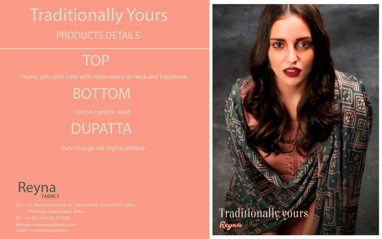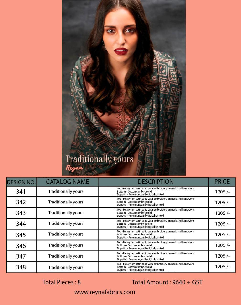 Buy Online Traditionally Yours By Reyna 341 Series Fancy Heavy Jam Satin Solid Salwar Kameez Catlog Wholesaler Surat 8 Pcs of Full Catalogue at Wholesale Price. Looking for Traditionally Yours By Reyna 341 Series Fancy Heavy Jam Satin Solid Salwar Kameez Catlog Wholesaler Surat Full Catalouge at Best Price? Buy Now Traditionally Yours By Reyna 341 Series Fancy Heavy Jam Satin Solid Salwar Kameez Catlog Wholesaler Surat at Wholesale Rate of Rs 9640 with Total 8 Pcs from authroized dealer and supplier of Brand. Cost of Each piece is just only Rs 1205 which is very low and affordable price to resale the product in your retail store ,This is Surat based Wholesale Supplier & Dealer of Brand. Click on Brand name to Know more about Brand's products.Call or Whatsapp on 9898838984 for booking or enquiry