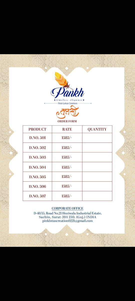 Buy Online Tulshi By Pink Lotus Creation Series 501 To 507 Single And Set Stockiest And Supplier From Surat 7 Pcs of Full Catalogue at Wholesale Price. Looking for Tulshi By Pink Lotus Creation Series 501 To 507 Single And Set Stockiest And Supplier From Surat Full Catalouge at Best Price? Buy Now Tulshi By Pink Lotus Creation Series 501 To 507 Single And Set Stockiest And Supplier From Surat at Wholesale Rate of Rs 11095 with Total 7 Pcs from authroized dealer and supplier of Brand. Cost of Each piece is just only Rs 1585 which is very low and affordable price to resale the product in your retail store ,This is Surat based Wholesale Supplier & Dealer of Brand. Click on Brand name to Know more about Brand's products.Call or Whatsapp on 9898838984 for booking or enquiry