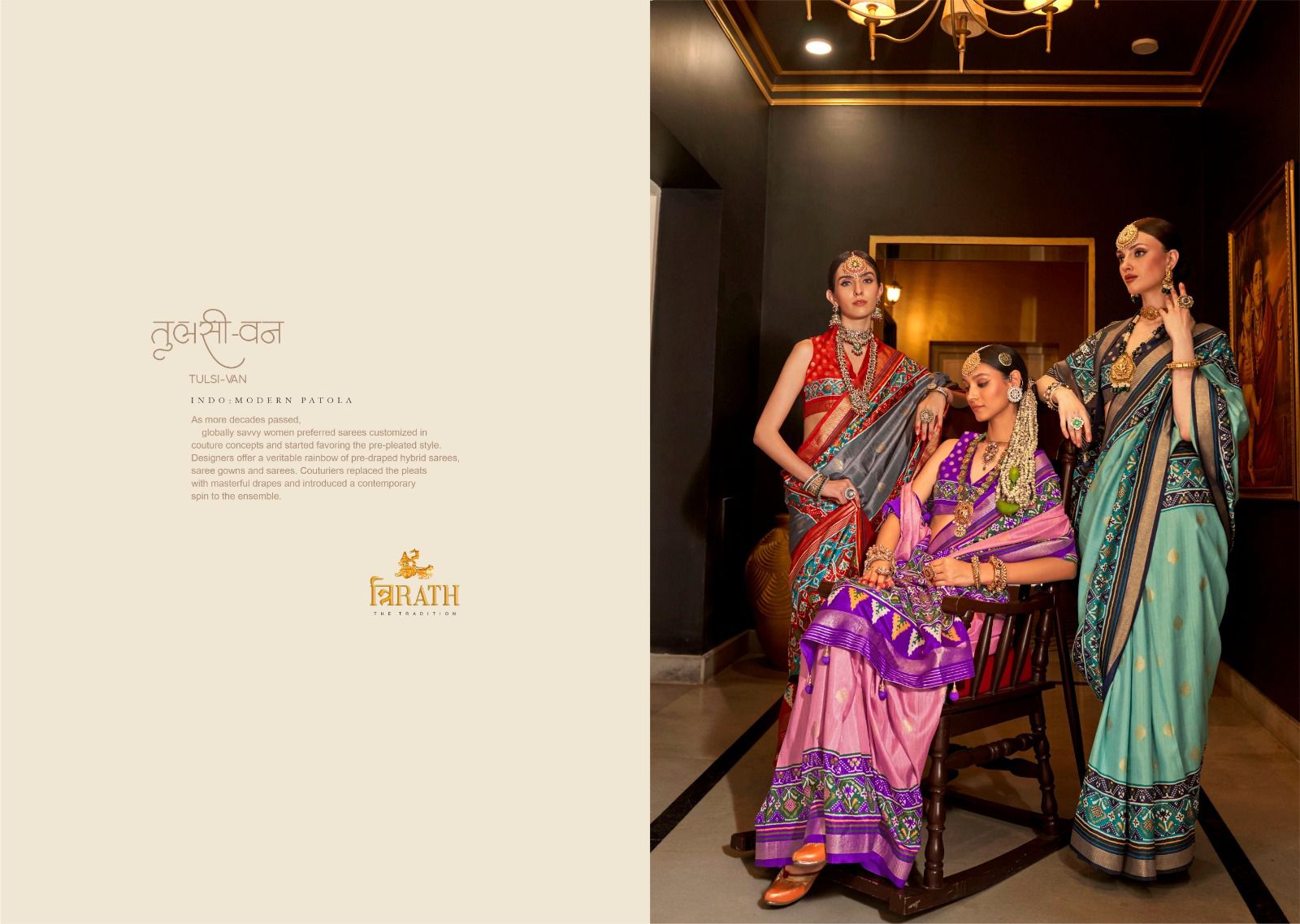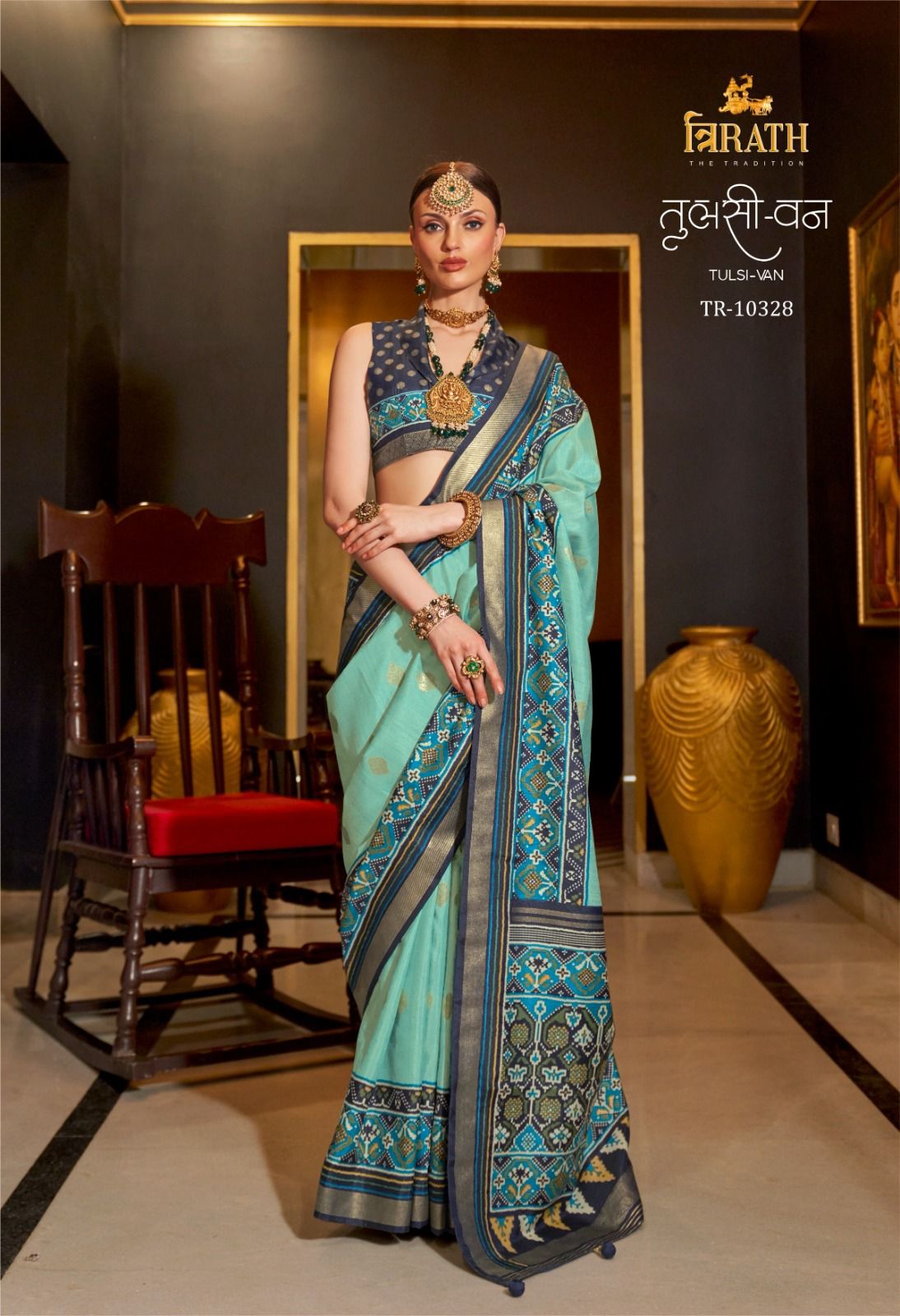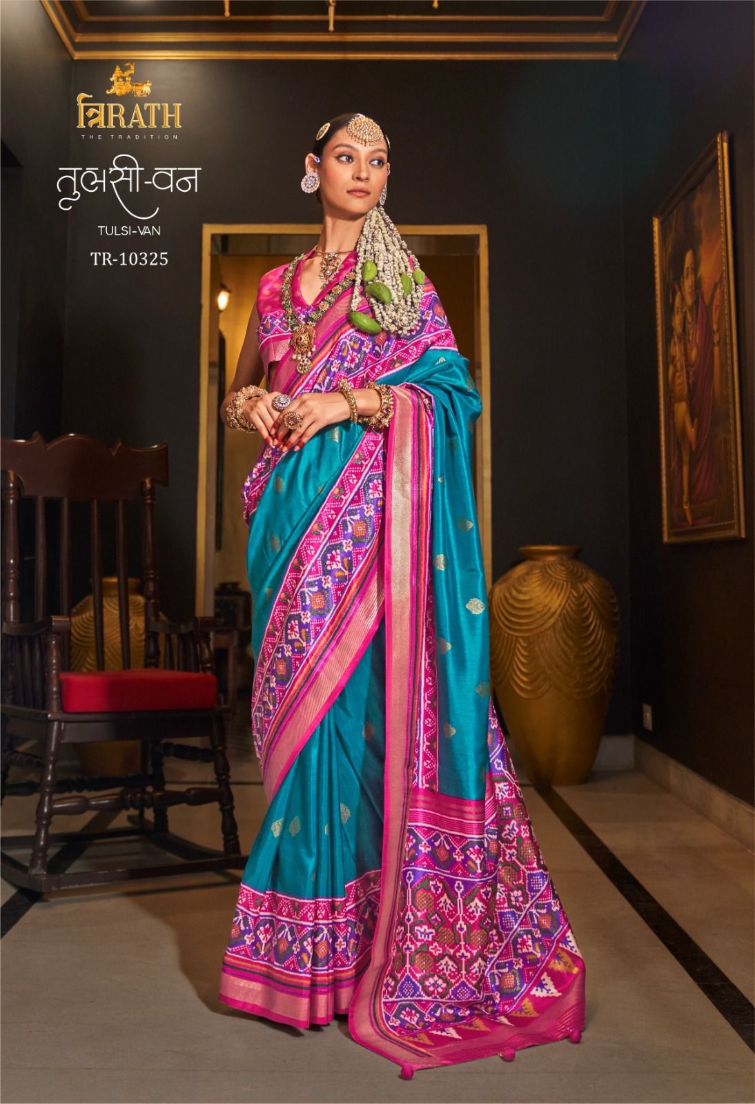Brand : Trirath Catalogue Name:- Tulsi-Van Series : 10321 To 10329 Fabric Details:- Mercerized Sigma Silk With Classical Patola Design And Elegent Gold Print With Aqua Finish Rate:-995/- +5%Gst Occasion : Party Wear, Festival Wear 100+. Singl |