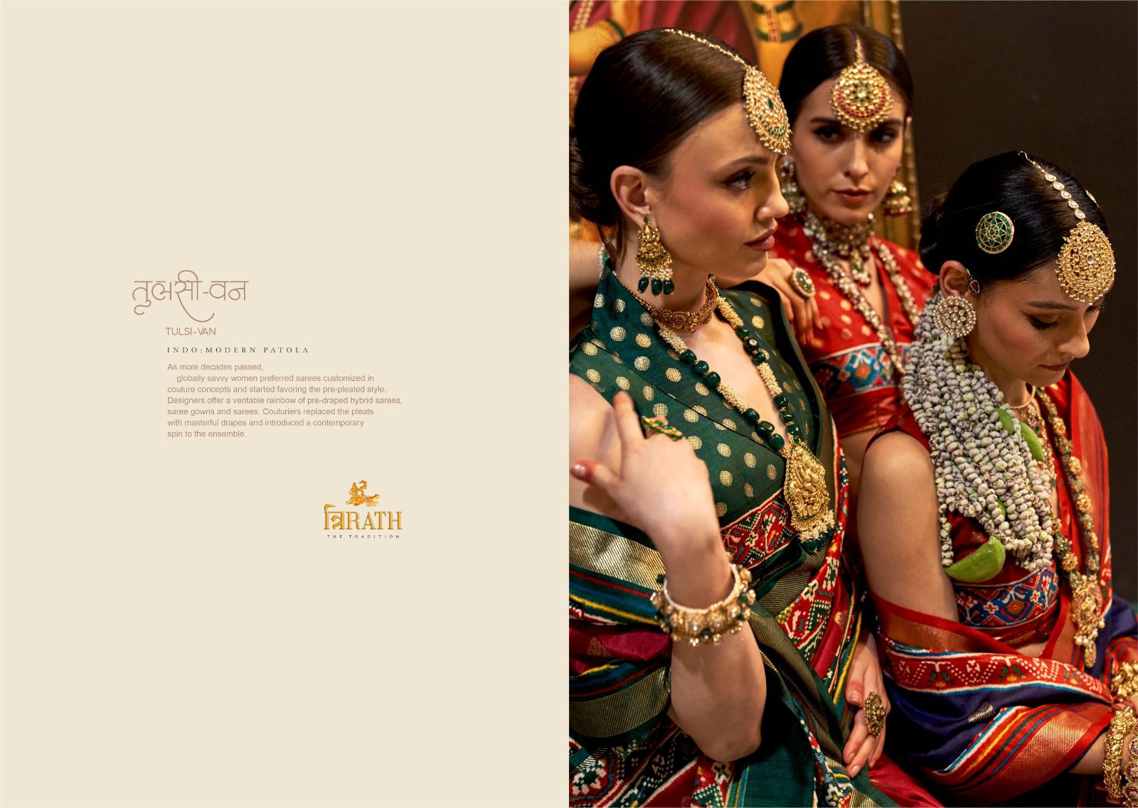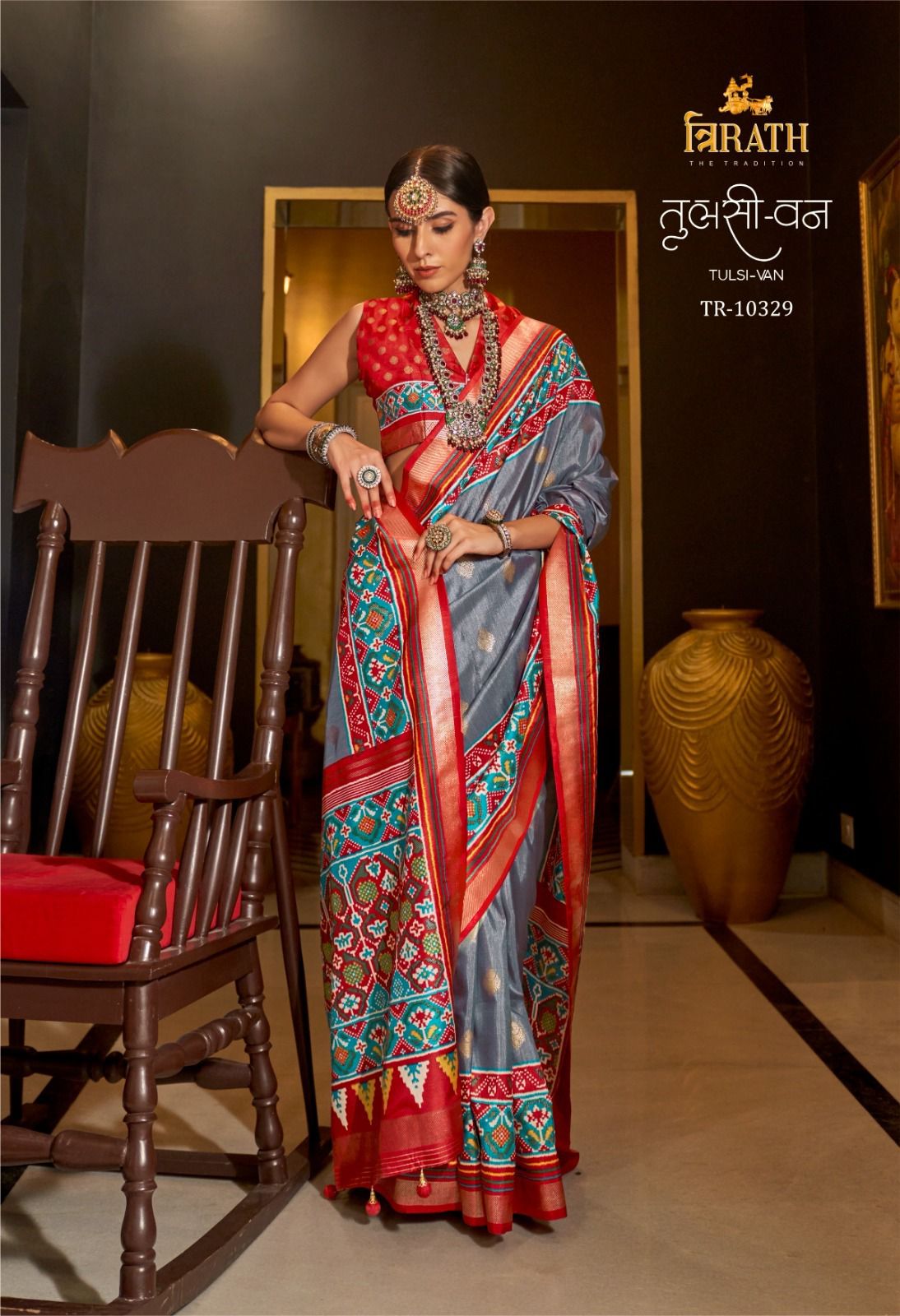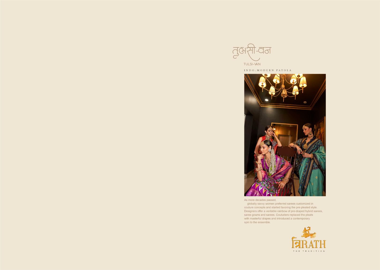 Brand : Trirath Catalogue Name:- Tulsi-Van Series : 10321 To 10329 Fabric Details:- Mercerized Sigma Silk With Classical Patola Design And Elegent Gold Print With Aqua Finish Rate:-995/- +5%Gst Occasion : Party Wear, Festival Wear 100+. Singl |