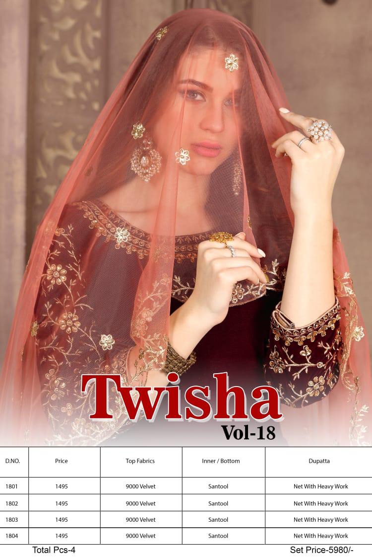 Buy Online Twisha 1800 Series Designer Party Wear Suits Wholesale Supplier Gujarat 4 Pcs of Full Catalogue at Wholesale Price. Looking for Twisha 1800 Series Designer Party Wear Suits Wholesale Supplier Gujarat Full Catalouge at Best Price? Buy Now Twisha 1800 Series Designer Party Wear Suits Wholesale Supplier Gujarat at Wholesale Rate of Rs 5980 with Total 4 Pcs from authroized dealer and supplier of Brand. Cost of Each piece is just only Rs 1495 which is very low and affordable price to resale the product in your retail store ,This is Surat based Wholesale Supplier & Dealer of Brand. Click on Brand name to Know more about Brand's products.Call or Whatsapp on 9898838984 for booking or enquiry