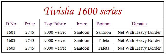 Buy Online Twisha By Ananay Series 1600 Designer Party Wear Suits Wholesale Supplier Nd Dealer Gujarat 3 Pcs of Full Catalogue at Wholesale Price. Looking for Twisha By Ananay Series 1600 Designer Party Wear Suits Wholesale Supplier Nd Dealer Gujarat Full Catalouge at Best Price? Buy Now Twisha By Ananay Series 1600 Designer Party Wear Suits Wholesale Supplier Nd Dealer Gujarat at Wholesale Rate of Rs 8235 with Total 3 Pcs from authroized dealer and supplier of Brand. Cost of Each piece is just only Rs 2745 which is very low and affordable price to resale the product in your retail store ,This is Surat based Wholesale Supplier & Dealer of Brand. Click on Brand name to Know more about Brand's products.Call or Whatsapp on 9898838984 for booking or enquiry