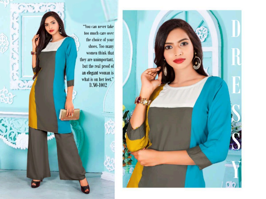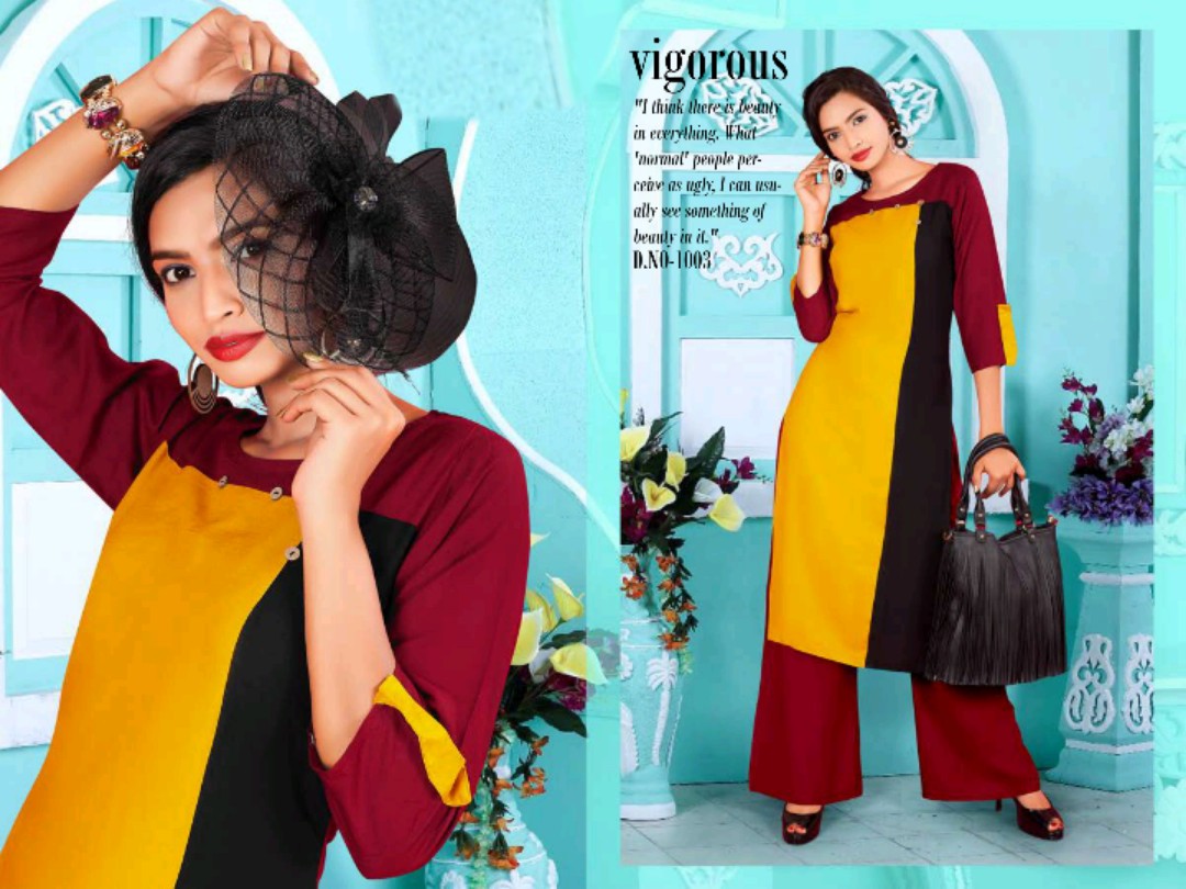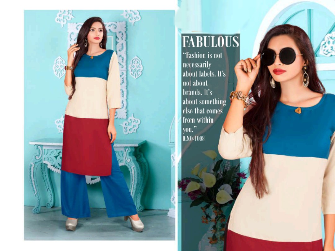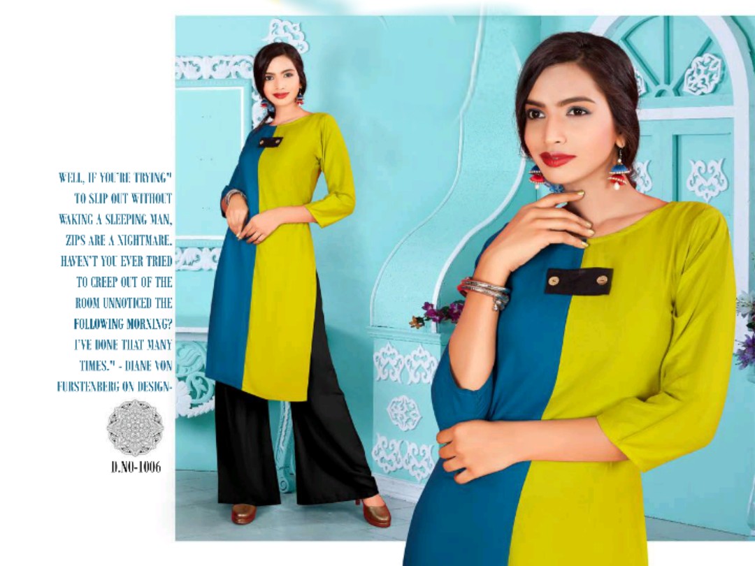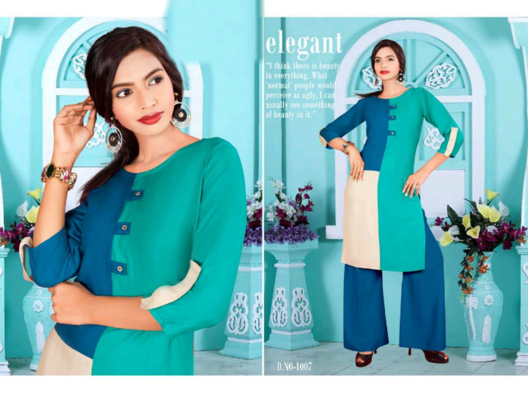 Buy Online Unique 1001 Series Reyon Kurti With Plazzo Catlog Wholesale Dealer And Supplier Surat 8 Pcs of Full Catalogue at Wholesale Price. Looking for Unique 1001 Series Reyon Kurti With Plazzo Catlog Wholesale Dealer And Supplier Surat Full Catalouge at Best Price? Buy Now Unique 1001 Series Reyon Kurti With Plazzo Catlog Wholesale Dealer And Supplier Surat at Wholesale Rate of Rs 4120 with Total 8 Pcs from authroized dealer and supplier of Brand. Cost of Each piece is just only Rs 515 which is very low and affordable price to resale the product in your retail store ,This is Surat based Wholesale Supplier & Dealer of Brand. Click on Brand name to Know more about Brand's products.Call or Whatsapp on 9898838984 for booking or enquiry