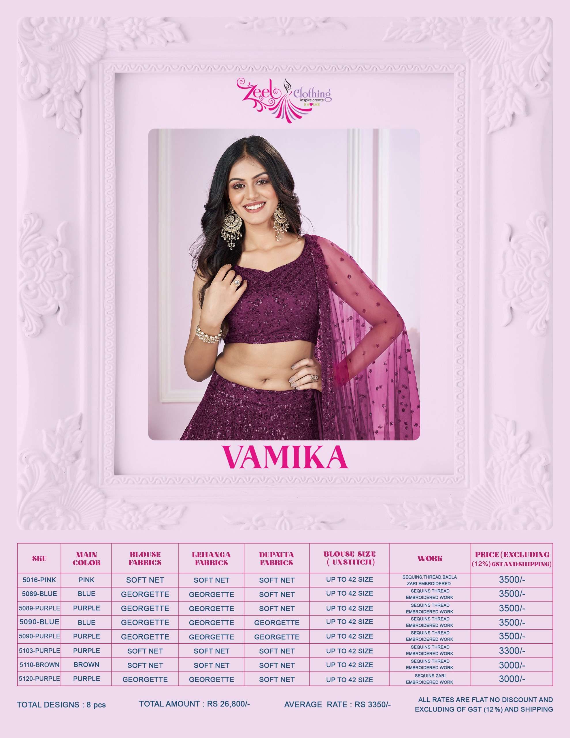 Buy Online Vamika by Zeel clothing Lehenga Choli collection manufacturers surat 8 Pcs of Full Catalogue at Wholesale Price. Looking for Vamika by Zeel clothing Lehenga Choli collection manufacturers surat Full Catalouge at Best Price? Buy Now Vamika by Zeel clothing Lehenga Choli collection manufacturers surat at Wholesale Rate of Rs 0 with Total 8 Pcs from authroized dealer and supplier of Zeel Clothing Brand. Cost of Each piece is just only Rs 0 which is very low and affordable price to resale the product in your retail store ,This is Surat based Wholesale Supplier & Dealer of Zeel Clothing Brand. Click on Brand name to Know more about Zeel Clothing Brand's products.Call or Whatsapp on 9898838984 for booking or enquiry