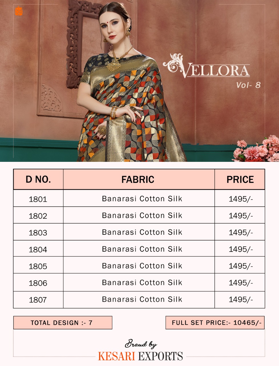 Buy Online Vellora Saree Vol 8 By Kesari Exports Silk Sarees Set And Single Wholesale Supplier And Dealer Gujarat 7 Pcs of Full Catalogue at Wholesale Price. Looking for Vellora Saree Vol 8 By Kesari Exports Silk Sarees Set And Single Wholesale Supplier And Dealer Gujarat Full Catalouge at Best Price? Buy Now Vellora Saree Vol 8 By Kesari Exports Silk Sarees Set And Single Wholesale Supplier And Dealer Gujarat at Wholesale Rate of Rs 10465 with Total 7 Pcs from authroized dealer and supplier of BRAND'S Brand. Cost of Each piece is just only Rs 1495 which is very low and affordable price to resale the product in your retail store ,This is Surat based Wholesale Supplier & Dealer of BRAND'S Brand. Click on Brand name to Know more about BRAND'S Brand's products.Call or Whatsapp on 9898838984 for booking or enquiry
