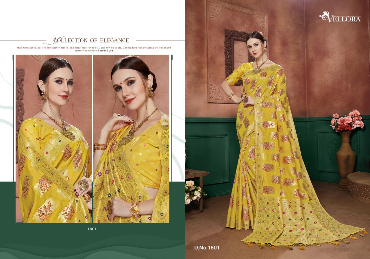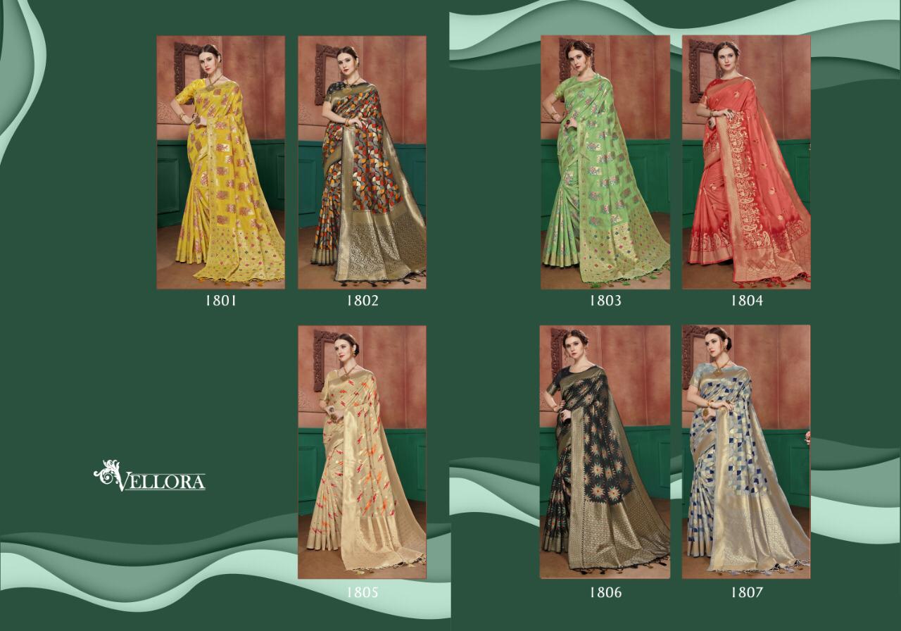 ||OM SHREE GANESHAY NAMAH|| Kesari Exports ?We have great pleasure to launch our new catalog Vellora Saree Vol -8?? Catlog Name- Vellora Saree Vol-8 Rate : 1495 GST 5 Percent Extra Fabric : Banarasi cotton Silk Singles and Set to Set Both Available Series 1801 to 1807. * set & loose & singel * Single extra 100 Hurry up?? Book your orders now. |