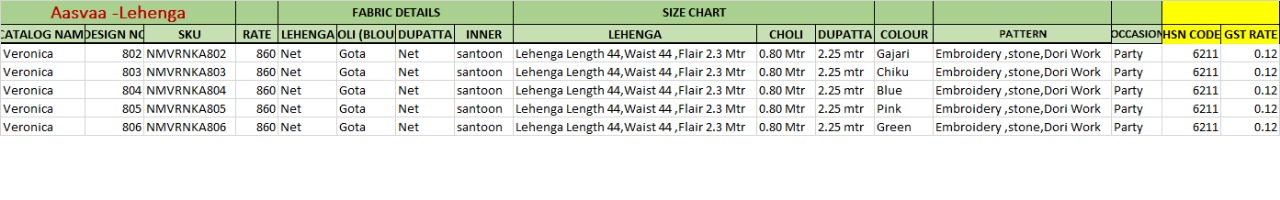 Buy Online Veronica By Aasvaa Lehenga Wholesale Supplier And Dealer Surat 5 Pcs of Full Catalogue at Wholesale Price. Looking for Veronica By Aasvaa Lehenga Wholesale Supplier And Dealer Surat Full Catalouge at Best Price? Buy Now Veronica By Aasvaa Lehenga Wholesale Supplier And Dealer Surat at Wholesale Rate of Rs 4300 with Total 5 Pcs from authroized dealer and supplier of Brand. Cost of Each piece is just only Rs 860 which is very low and affordable price to resale the product in your retail store ,This is Surat based Wholesale Supplier & Dealer of Brand. Click on Brand name to Know more about Brand's products.Call or Whatsapp on 9898838984 for booking or enquiry