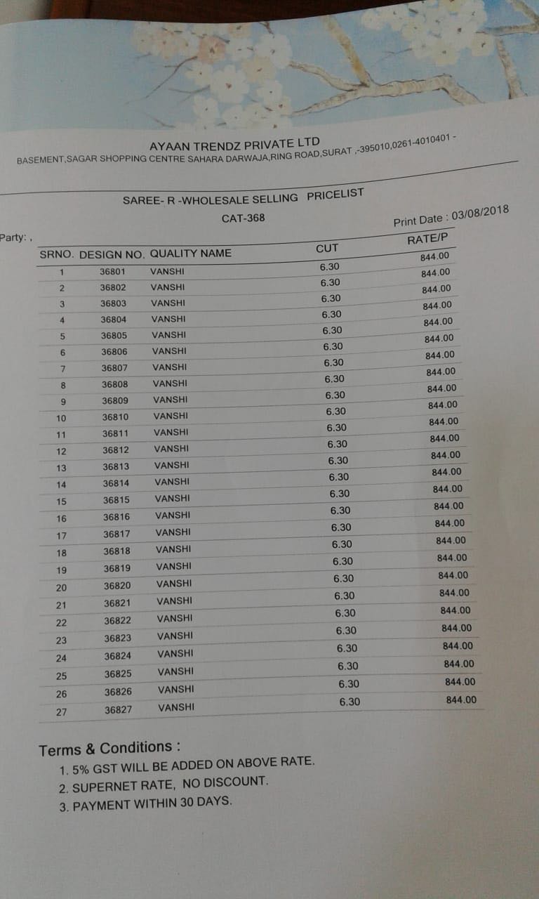Brand - Vipul . Type - saree. Series -36801 to 36827. Fabric- Zorgett. Set to set. GST 5 Percent Extra. Delivery from- 09-08-18 New Catlog by Vipul saree. Book your order now |